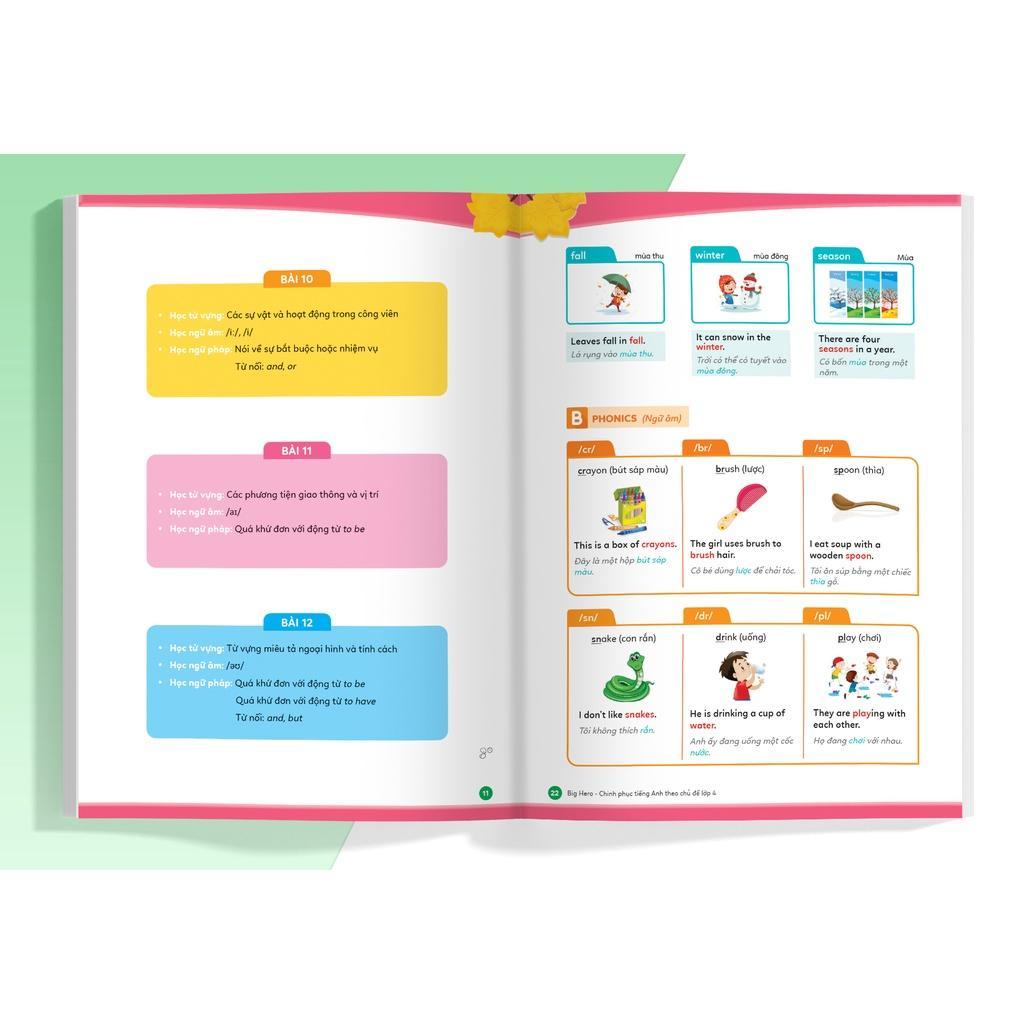 BIG HERO – Chinh phục tiếng anh theo chủ đề lớp 4 gồm 12 chủ đề thân thuộc với các em. Lồng ghép trong mỗi chủ đề chính là các kiến thức và bài tập tiếng Anh, mỗi bài học gồm rất nhiều phần chi tiết cho các em học sinh học và ôn tập.
