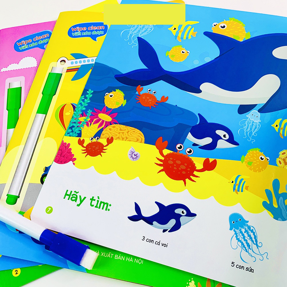 Sách - Bộ 4 quyển viết xóa được Wipe Clean trò chơi nối số tìm kiếm thông minh luyện viết không sợ sai ✿ Vở Trò chơi phát triển trí tuệ, tìm kiếm thông minh, trò chơi nối số luyện kĩ năng đếm hình, đếm số lượng, so sánh, làm toán cộng trừ và tư duy logic về thế giới xung quanh cho bé từ 2-6 tuổi. ✿ Giúp trẻ vừa học vừa chơi, rèn luyện kĩ năng cầm bút, rèn luyện khả năng quan sát, ghi nhớ, tư duy logic. Với các trò chơi từ cấp độ dễ đến khó sẽ thu hút trẻ và kích thích não bộ của trẻ phát triển, giúp trẻ càng chơi càng thông minh. ✿ Bộ vở được cán màng bóng đặc biệt giúp trẻ có thể viết và xóa được dễ dàng khi dùng bút lông viết bảng trắng, dùng được nhiều lần, tiết kiệm chi phí. ✿ Trọn bộ gồm 4 quyển: Trò chơi nối số tập 1 Trò chơi nối số tập 2 Tìm kiếm thông minh 1 Tìm kiếm thông minh 2 ✿ Vở tập hợp những bài tập từ dễ đến khó. Hình ảnh minh họa rõ ràng. ✿ Bộ vở toán được cán màng bóng đặc biệt giúp trẻ có thể viết và xóa được khi dùng bút dạ bảng trắng, dùng được nhiều lần, tiết kiệm chi phí.