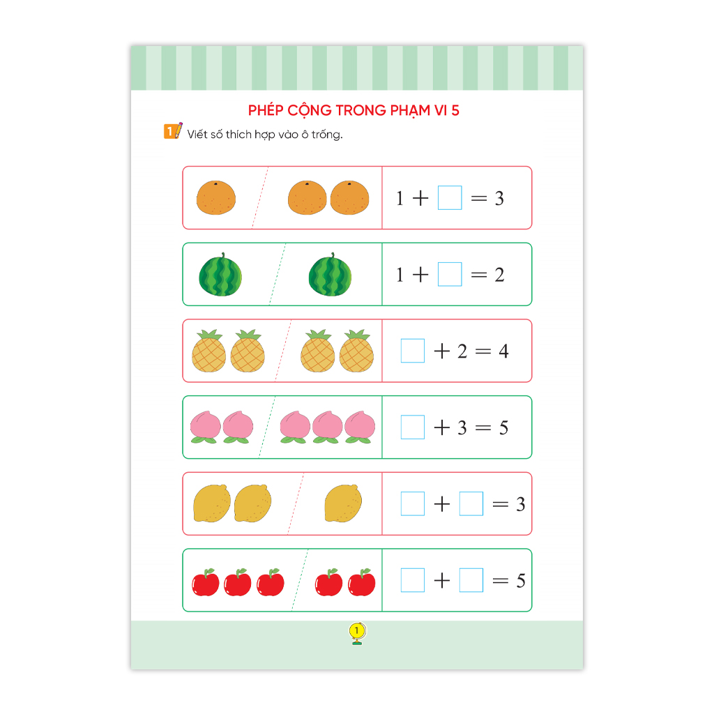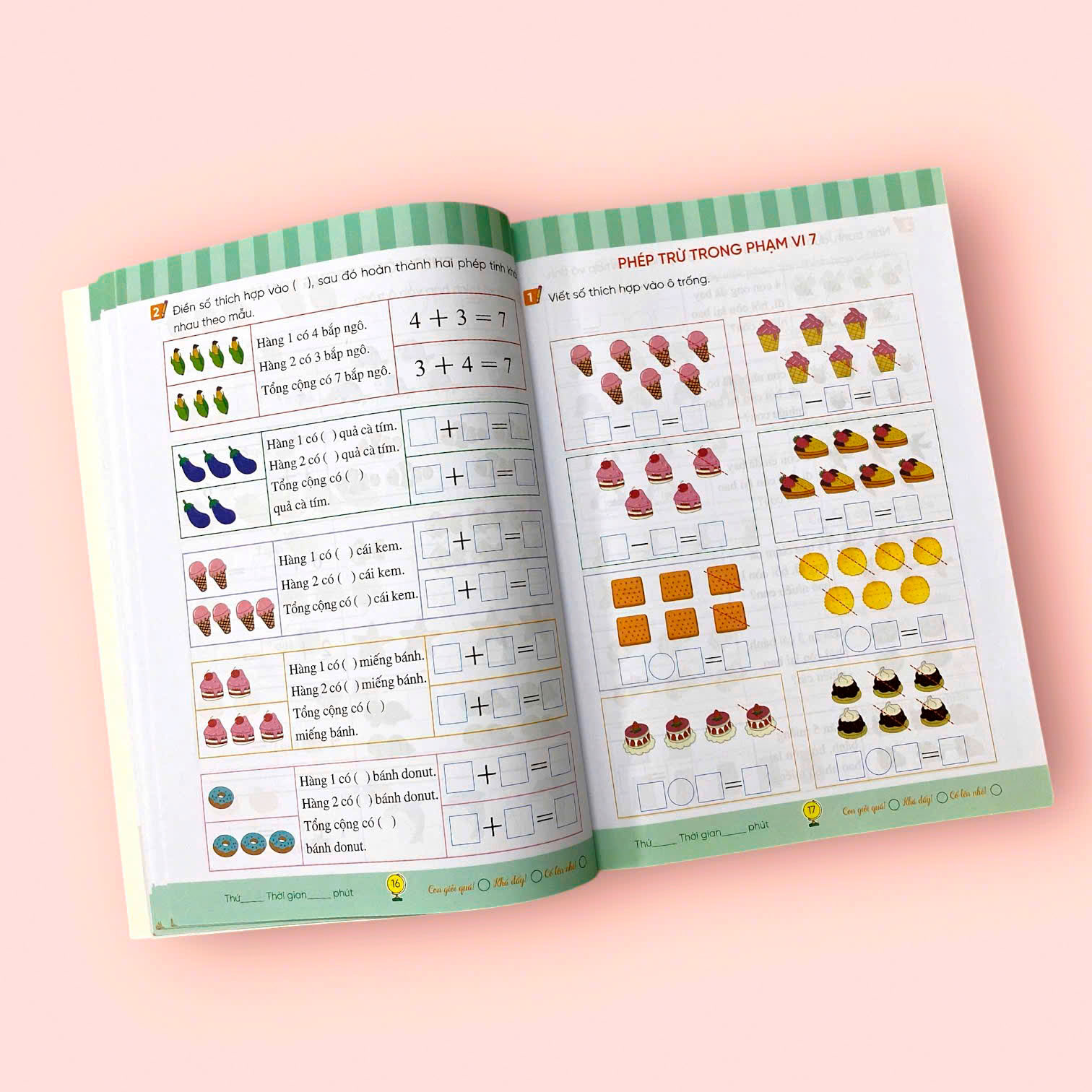 Nội dung và hình ảnh được thiết kế phù hợp với trẻ tiền tiểu học, giúp bé dễ dàng nắm bắt và hứng thú với môn toán.