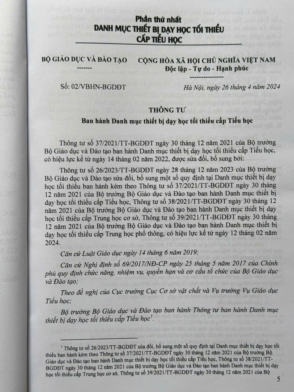 – Văn bản hợp nhất số: 02/VBHN-BGDĐT ngày 26 tháng 4 năm 2024 của Bộ Giáo dục và Đào tạo hợp nhất Thông tư về Danh mục thiết bị dạy học tối thiểu cấp Tiểu học,