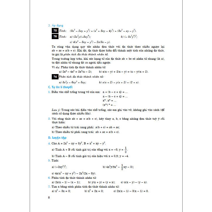 Mục Luyện tập dành cho các em tự làm để củng cố và hoàn thiện các kiến thức, kĩ năng vừa tiếp nhận. Các bài tập được đánh số liên tục ở mỗi chương. Các em cần làm hết các bài tập này vì chúng là những bài tập cơ bản nhất.