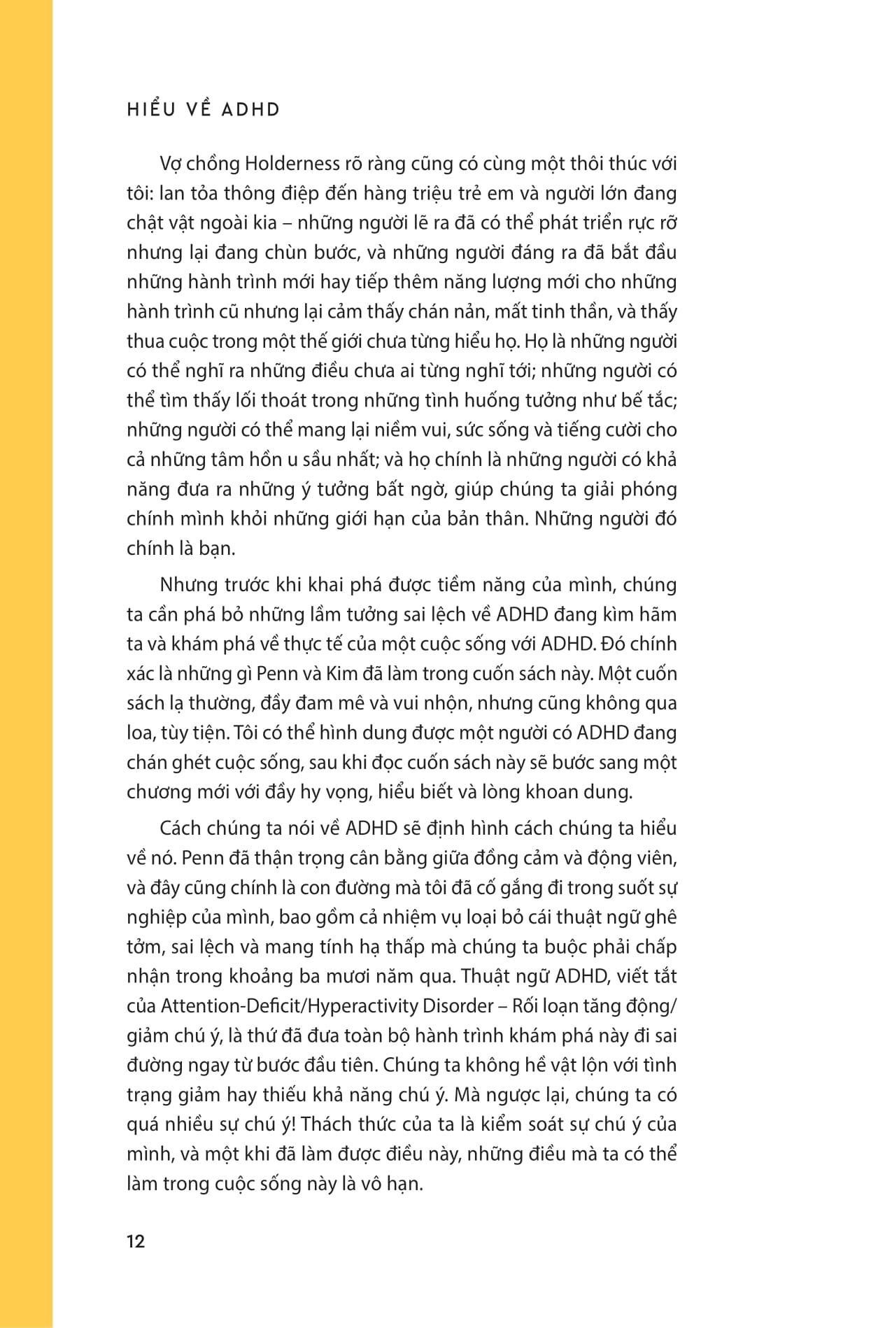 Đọc cuốn sách này, bạn sẽ cười vì những tình huống khó đỡ, sẽ thấy lòng m.ình nhẹ đi khi nhận ra m.ình không hề đơn độc, và sẽ tìm thấy những công cụ để sống hài hòa hơn với bộ não khác biệt của m.ình. Hiểu về ADHD không hứa hẹn biến mọi thứ trở nên hoàn hảo, nhưng chắc chắn sẽ giúp bạn nhận ra: bạn không phải là một mớ hỗn độn hay một thảm họa, bạn là một con người đầy màu sắc, và thế giới này cần sự hiện diện của bạn đúng như bạn vốn có.