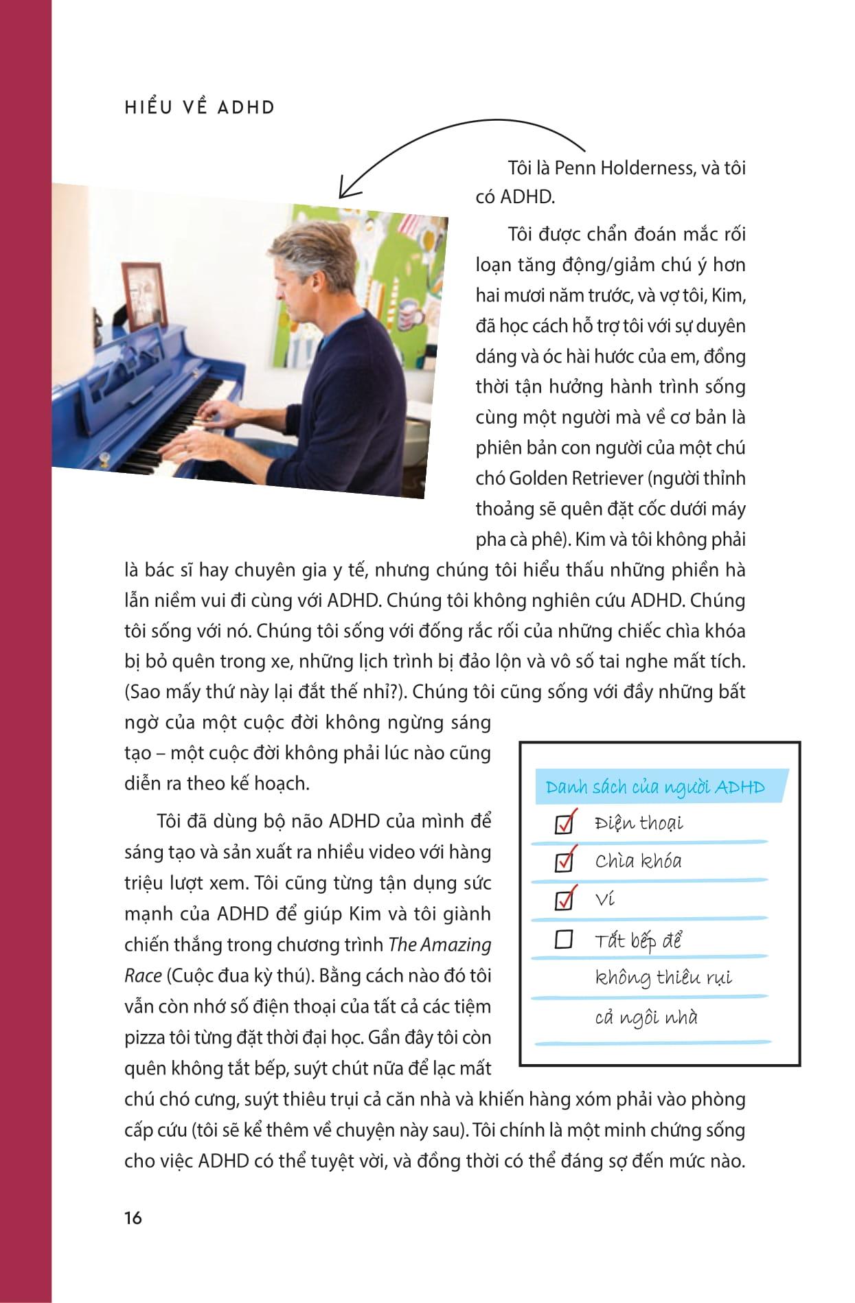 Nội dung sách được chia thành ba phần. Ở phần đầu, Penn và Kim giải thích ADHD là gì, nguyên nhân từ đâu, biểu hiện ra sao ở trẻ em, người lớn, phụ nữ và các nhóm khác nhau. Bạn sẽ nhận ra những hiểu lầm phổ biến – như việc cho rằng ADHD đồng nghĩa với “thiếu tập trung” hay “lười biếng”, thực chất chỉ là kết quả của sự thiếu hiểu biết về cách não bộ ADHD xử lý thông tin. Phần hai tập trung vào việc thay đổi câu chuyện mà chúng ta vẫn thường kể về ADHD. Thay vì chỉ nói về khuyết điểm và hạn chế, tác giả chỉ ra những khía cạnh tích cực, cả trong công việc, sáng tạo, mối quan hệ và cuộc sống. Cuối cùng, phần ba đưa ra những chiến lược thực tiễn: cách quản lý năng lượng, xây dựng thói quen, điều chỉnh môi trường sống, hoàn thành mục tiêu và chăm sóc bản thân.