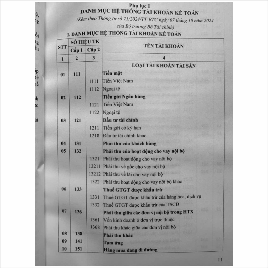 - Toàn bộ sách bìa mềm khổ lớn 19 x 27 cm phân phối bởi Nhà sách Nam Việt đều được bọc sách Plastic MIỄN PHÍ và xuất hóa đơn điện tử đầy đủ, nhanh chóng. …//… Lời giới thiệu: Ngày 07 tháng 10 năm 2024, Bộ Tài chính đã chính thức ban hành Thông tư số 71/2024/TT-BTC hướng dẫn Chế độ kếtoán hợp tác xã, liên hiệp hợp tác xã. Nhằm hướng dẫn về chứng từ kế toán, tài khoản kế toán, nguyên tắc ghi sổ kế toán, lập và trình bày Báo cáo tài chính của hợp tác xã, liên hiệp hợp tác xã; không áp dụng cho việc xác định nghĩa vụ thuế của hợp tác xã đối với ngân sách Nhà nước. Việc ghi sổ kế toán phải căn cứ vào các chứng từ kế toán được phản ánh trên cơ sở các giao dịch kinh tế phát sinh và đã hoàn thành. Hợp tác xã phải tuân thủ các quy định của pháp luật, cơ chế, chính sách liên quan khi thực hiện các giao dịch kinh tế. Nhằm phổ biến đến Quý Cơ quan, Đơn vị và Quý khách hàng thân thiết nắm bắt kịp thời những quy định mới nêu trên. Nhà sách Nam Việt xin trân trọng giới thiệu cuốn sách: Hướng Dẫn Chế Độ Kế Toán Hợp Tác Xã, Liên Hiệp Hợp Tác Xã theo Thông Tư Số 71/2024/TT-BTC ngày 07/10/2024 …//… Nội dung cuốn sách bao gồm những nội dung chính như sau: Chương I. QUY ĐỊNH CHUNG Chương II. QUY ĐỊNH CỤ THỂ Chương III. ĐIỀU KHOẢN THI HÀNH Phụ lục I. DANH MỤC HỆ THỐNG TÀI KHOẢN KẾ TOÁN Phụ lục II. DANH MỤC, BIỂU MẪU VÀ PHƯƠNG PHÁP LẬP CHỨNG TỪ KẾ TOÁN Phụ lục III. DANH MỤC SỔ KẾ TOÁN, BIỂU MẪU SỔ KẾ TOÁN VÀ PHƯƠNG PHÁP GHI SỔ KẾ TOÁN VÀ HÌNH THỨC SỔ KẾ TOÁN Phụ lục IV. BIỂU MẪU BÁO CÁO TÀI CHÍNH, NỘI DUNG VÀ PHƯƠNG PHÁP LẬP, TRÌNH BÀY BÁO CÁO TÀI CHÍNH *** Quý khách hàng hãy an tâm khi mua sách tại Nhà sách Nam Việt, cam kết uy tín, chất lượng, sách bản gốc chuẩn đẹp, được kiểm hàng, hài lòng mới thanh toán, sách đã được bọc plastic cao cấp miễn phí! …//… Cảm ơn các bạn đã ghé thăm shop Nhà sách Nam Việt ! Sách Hướng Dẫn Chế Độ Kế Toán Hợp Tác Xã, Liên Hiệp Hợp Tác Xã theo Thông Tư Số 71/2024/TT-BTC ngày 07/10/2024 Sách Hướng Dẫn Chế Độ Kế Toán Hợp Tác Xã, Liên Hiệp Hợp Tác Xã theo Thông Tư Số 71/2024/TT-BTC ngày 07/10/2024