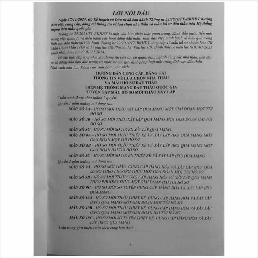 - Toàn bộ sách bìa mềm khổ lớn 20 x 28 cm phân phối bởi Nhà sách Nam Việt đều được bọc sách Plastic MIỄN PHÍ và xuất hóa đơn điện tử đầy đủ, nhanh chóng. …/… Lời giới thiệu: Ngày 17/11/2024, Bộ Kế hoạch và Đầu tư đã ban hành Thông tư số 22/2024/TT-BKHĐT hướng dẫn việc cung cấp, đăng tải thông tin về lựa chọn nhà thầu và mẫu hồ sơ đấu thầu trên Hệ thống mạng đấu thầu quốc gia. Thông tư 22/2024/TT-BKHĐT là một văn bản pháp luật quan trọng, đánh dấu bước tiến mới trong việc quản lý và điều hành các hoạt động đấu thầu, thúc đẩy việc minh bạch và hiệu quả trong lĩnh vực đấu thầu tại Việt Nam. Thông tư 22/2024/TT-BKHĐT cung cấp 42 mẫu hồ sơ chuẩn hóa (Từ Mẫu 1A tới Mẫu 14D) và 17 phụ lục (Từ Phụ lục 1A- Phụ lục 10), chính thức có hiệu lực từ 01/01/2025 (một phần hiệu lực từ 01/12/2024). Để kịp thời đáp ứng nhu cầu thông tin của các cơ quan, ban, ngành cùng các nhà thầu, nhà đầu tư và đông đảo bạn đọc trong cả nước về các quy định pháp luật mới trong lĩnh vực đấu thầu, Nhà sách Nam Việt xin trân trọng giới thiệu cuốn sách: Hướng Dẫn Cung Cấp, Đăng Tải Thông Tin Về Lựa Chọn Nhà Thầu Và Mẫu Hồ Sơ Đấu Thầu Trên Hệ Thống Mạng Đấu Thầu Quốc Gia – Tuyển Tập Mẫu Hồ Sơ Mời Thầu Xây Lắp (tập 2) …//… Nội dung quyển 2 gồm các nội dung sau: MẪU SỐ 9A. Hồ Sơ Mời Thầu Cung Cấp Hàng Hóa Và Xây Lắp (PC) Qua Mạng Theo Phương Thức Một Giai Đoạn Một Túi Hồ Sơ MẪU SỐ 9B. Hồ Sơ Mời Thầu Cung Cấp Hàng Hóa Và Xây Lắp Qua Mạng Theo Phương Thức Một Giai Đoạn Hai Túi Hồ Sơ MẪU SỐ 9C. Hồ Sơ Mời Sơ Tuyển Cung Cấp Hàng Hóa Và Xây Lắp (PC) Qua Mạng MẪU SỐ 10A. Hồ Sơ Mời Thầu Thiết Kế, Cung Cấp Hàng Hóa Và Xây Lắp (EPC) Qua Mạng Một Giai Đoạn Một Túi Hồ Sơ MẪU SỐ 10B. Hồ Sơ Mời Thầu Thiết Kế, Cung Cấp Hàng Hóa Và Xây Lắp (EPC) Qua Mạng Một Giai Đoạn Hai Túi Hồ Sơ MẪU SỐ 10C. Hồ Sơ Mời Sơ Tuyển Thiết Kế, Cung Cấp Hàng Hóa Và Xây Lắp (EPC) Qua Mạng …//… Quý khách tham khảo thêm nội dung quyển 1 như sau: MẪU SỐ 3A. Hồ Sơ Mời Thầu Xây Lắp Qua Mạng Một Giai Đoạn Một Túi Hồ Sơ MẪU SỐ 3B. Hồ Sơ Mời Thầu Xây Lắp Qua Mạng Một Giai Đoạn Hai Túi Hồ Sơ MẪU SỐ 3C. Hồ Sơ Mời Sơ Tuyển Xây Lắp Qua Mạng MẪU SỐ 8A. Hồ Sơ Mời Thầu Thiết Kế Và Xây Lắp (EC) Qua Mạng Một Giai Đoạn Một Túi Hồ Sơ MẪU SỐ 8B. Hồ Sơ Mời Thầu Thiết Kế Và Xây Lắp (EC) Qua Mạng Một Giai Đoạn Hai Túi Hồ Sơ MẪU SỐ 8C. Hồ Sơ Mời Sơ Tuyển Thiết Kế Và Xây Lắp (EC) Qua Mạng *** Quý khách hàng hãy an tâm khi mua sách tại Nhà sách Nam Việt, cam kết uy tín, chất lượng, sách bản gốc chuẩn đẹp, được kiểm hàng, hài lòng mới thanh toán, sách đã được bọc plastic cao cấp miễn phí! .../... Cảm ơn các bạn đã ghé thăm shop Nhà sách Nam Việt ! Sách Hướng Dẫn Cung Cấp, Đăng Tải Thông Tin về Lựa chọn Nhà Thầu và Mẫu Hồ Sơ Đấu Thầu Trên Hệ Thống Mạng Đấu Thầu Quốc Gia – Thông tư 22/2024/TT-BKHĐT (Quyển 2) Sách Hướng Dẫn Cung Cấp, Đăng Tải Thông Tin về Lựa chọn Nhà Thầu và Mẫu Hồ Sơ Đấu Thầu Trên Hệ Thống Mạng Đấu Thầu Quốc Gia – Thông tư 01/2024/TT-BKHĐT (Quyển 2)