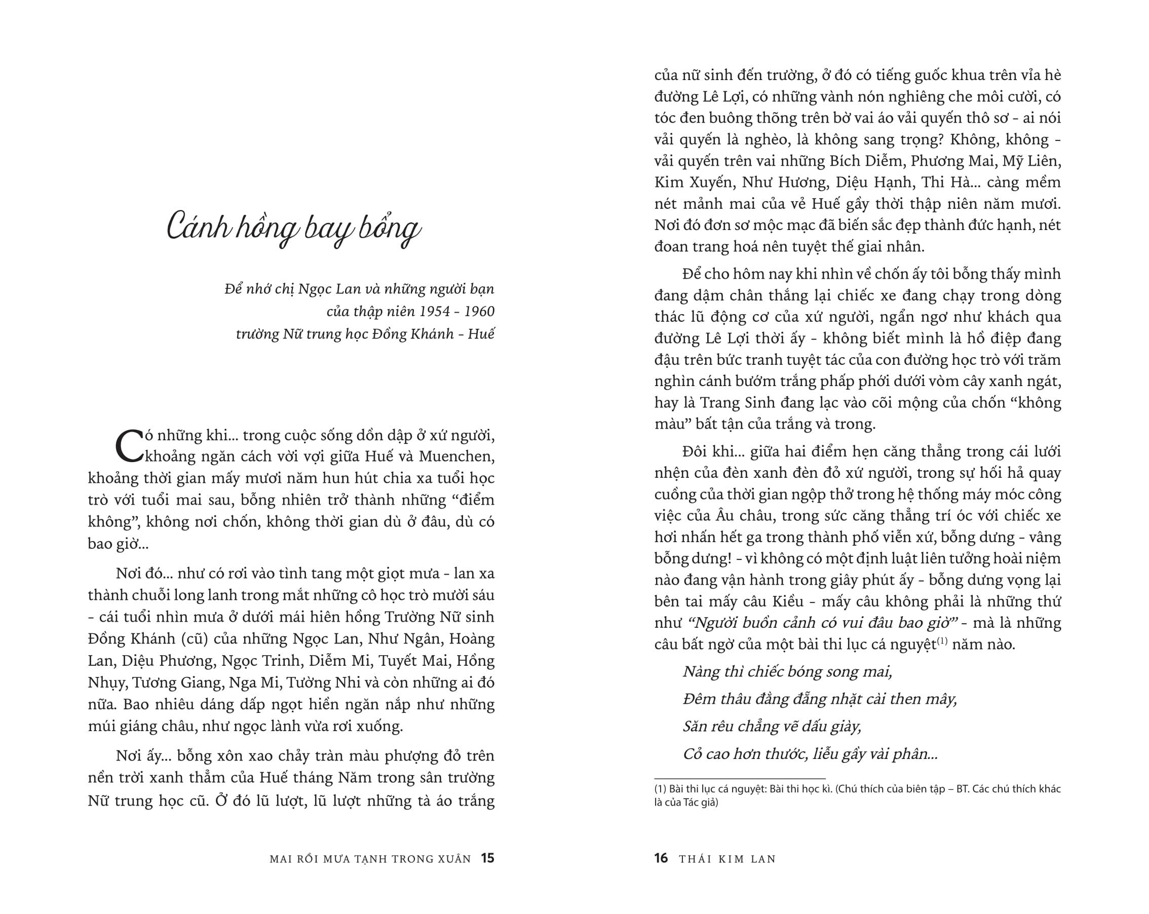 Lần bước theo cảm xúc trong tản văn Thái Kim Lan, người đọc sẽ cùng Tác giả vào Đường Sương, qua Đường Mưa để dần ngộ ra giữa chốn nhung nhớ ảo huyền ấy một MAI RỒI MƯA TẠNH TRONG XUÂN...