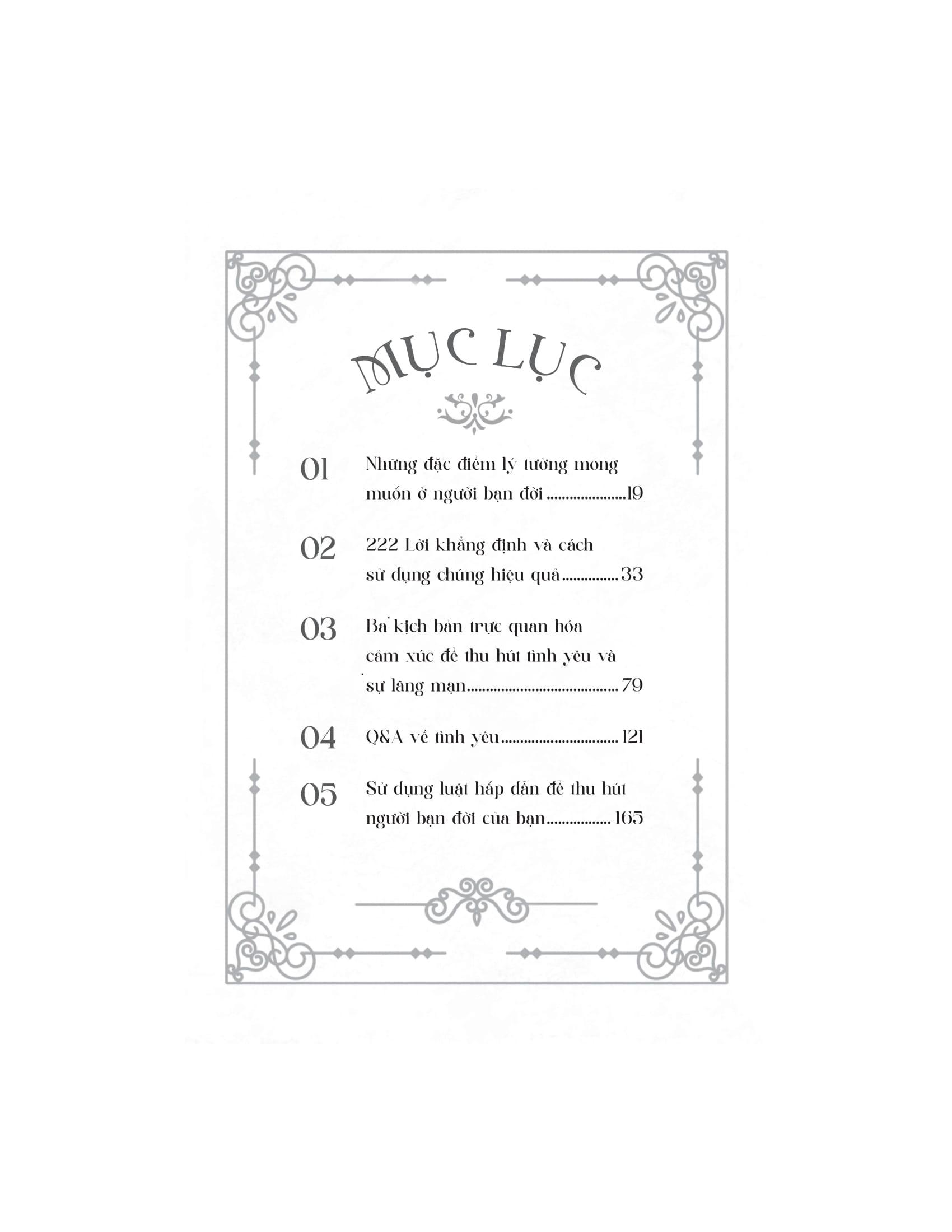 Manifest Tình Yêu Là chủ đề được bàn tán bởi đông đảo người dùng trên các trang mạng xã hội, luật hấp dẫn (Law of Attraction) - một triết lý cho rằng những suy nghĩ tích cực mang năng lượng tích cực sẽ giúp thu hút những kết quả tích cực - được phân tích và ứng dụng trong nhiều lĩnh vực, kể cả tình yêu. Hàm chứa các phương pháp thực hành cùng những câu chuyện thành công đã được kiểm chứng, Manifest Tình Yêu giúp bạn khai thác sức mạnh của cảm xúc và lời nói, hướng dẫn cụ thể về cách bày tỏ ý định rõ ràng, đưa ra lời khẳng định tích cực và vận dụng các công cụ một cách nhặt quán để "manifest" thành công một mối quan hệ nghiêm túc và dài lâu. Cuốn sách ManifestTình Yêu gồm 5 chương với từng nội dung sau: Chương 1: Những đặc điểm lý tưởng mong muốn ở người bạn đời Chương 2: 222 lời khẳng định và cách sử dụng chúng hiệu quả Chương 3: Ba kịch bản trực quan hoá cảm xúc để thu hút tình yêu và sự lãng mạn Chương 4: Q&A về tình yêu Chương 5: Sử dụng luật hấp dẫn để thu hút người bạn đời của bạn. Cuốn sách đã giúp rất nhiều người tìm được người bạn đời lý tưởng của m.ình. Hãy để nó giúp bạn trong hành trình tìm kiếm một nửa hoàn hảo của m.ình. Nếu bạn muốn những ước nguyện về tình yêu đích thực và lâu dài của m.ình trở thành hiện thực hãy biến cuốn sách này thành một trợ thủ đắc lực. Về tác giả Caterina Yolaine là một tác giả chuyên viết về lĩnh vực phát triển bản thân và tâm linh, đặc biệt nổi tiếng với những tác phẩm liên quan đến Luật Hấp Dẫn (Law of Attraction). Bà đã dành hơn 30 năm để chia sẻ kiến thức siêu hình về Luật Hấp Dẫn thông qua các cuốn sách, video và tài liệu thu âm. Một trong những tác phẩm nổi bật của bà là Manifest Your Millions, được đánh giá là một trong những cuốn sách bán chạy nhất về chủ đề này. Tại Việt Nam, cuốn sách Luật Hấp Dẫn Trong Tình Yêu của Caterina Yolaine đã được dịch và xuất bản bởi NXB Thanh Niên vào năm 2023, với sự hợp tác của 1980 Books và dịch giả Phí Mai. Cuốn sách cung cấp những phương pháp thực hành và hiểu biết sâu sắc về tâm linh, giúp người đọc áp dụng Luật Hấp Dẫn để thu hút tình yêu đích thực.