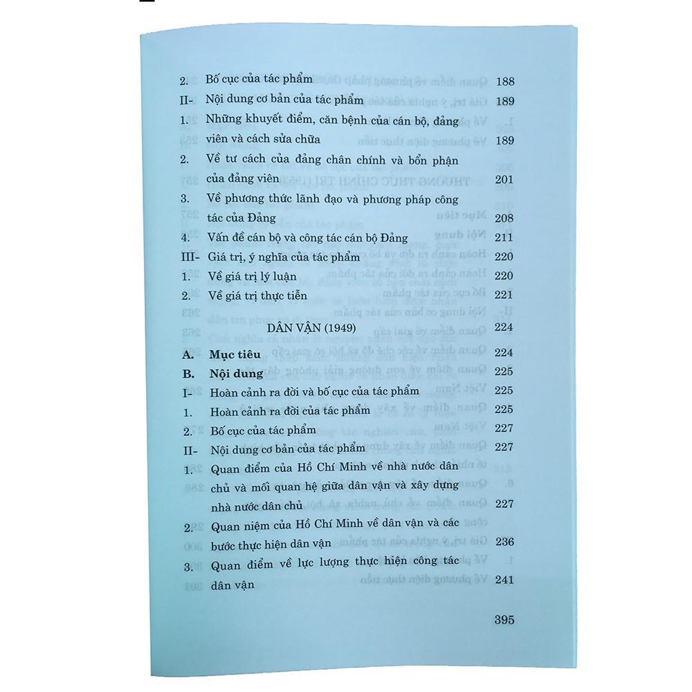 Nội dung cuốn sách gồm hai phần: Phần thứ nhất nêu một số vấn đề lý luận chung về dạy học tác phẩm Hồ Chí Minh; Phần thứ hai giới thiệu một số tác phẩm tiêu biểu của Hồ Chí Minh (như: Bản án chế độ thực dân Pháp, Đường kách mệnh, Cương lĩnh chính trị đầu tiên, Tuyên ngôn độc lập...). Trong mỗi tác phẩm, các tác giả xác định mục tiêu dạy học tác phẩm (năng lực, phẩm chất), hoàn cảnh ra đời và bố cục của tác phẩm, nội dung cơ bản của tác phẩm, giá trị của tác phẩm và một số câu hỏi ôn tập, củng cố...