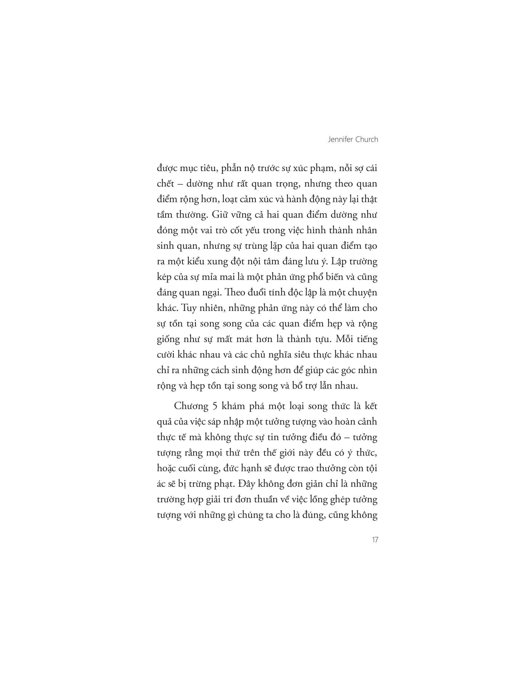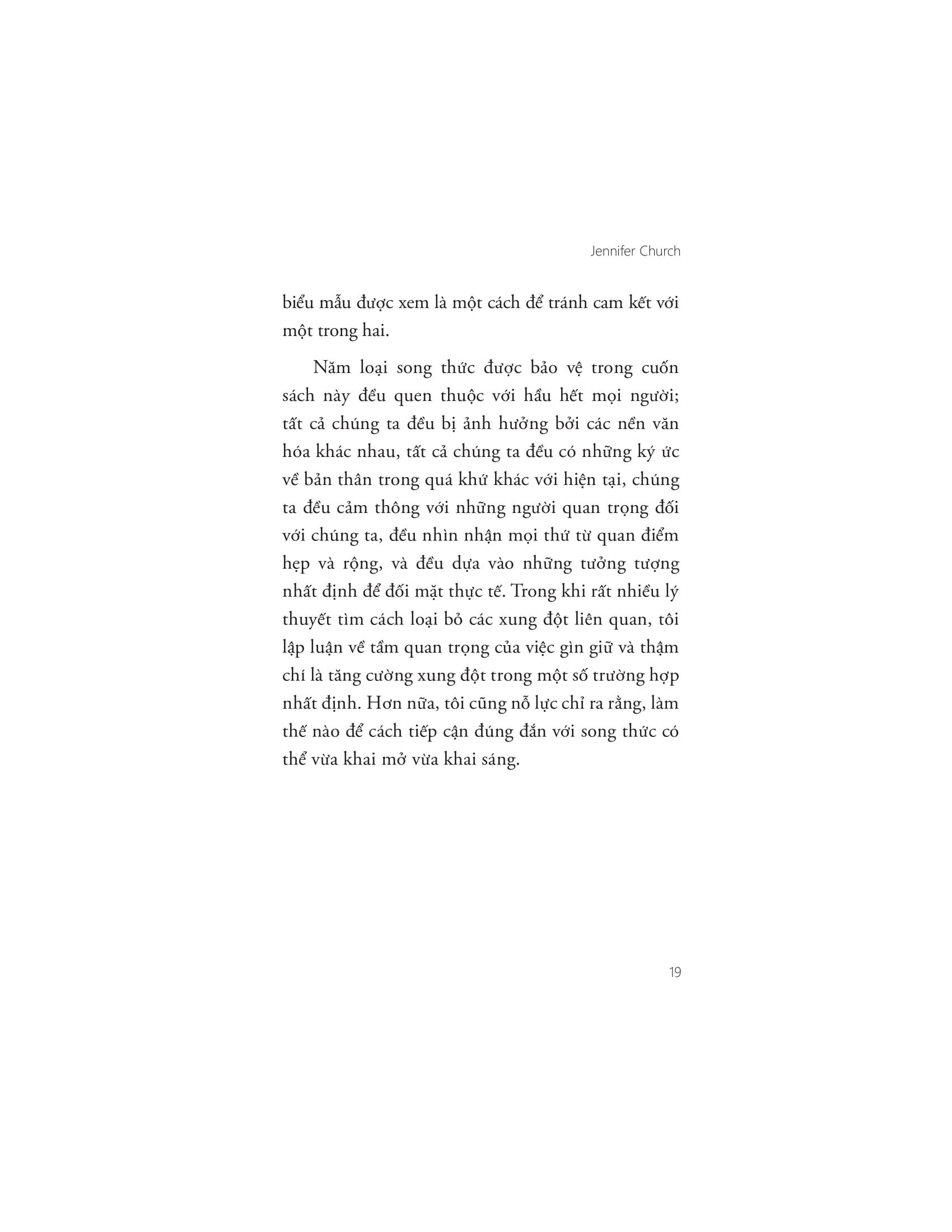 • Những tưởng tượng mâu thuẫn với niềm tin có thể đóng một vai trò tích cực trong cách chúng ta sống và đưa ra các quyết định quan trọng. “Thấu hiểu mâu thuẫn nội tâm” là cuốn sách dành cho tất cả những ai có hai quan điểm đối lập cùng một lúc, gợi ý chúng ta biết chấp nhận thực tế và kiểm soát xung đột nội tại để biến khó khăn thành cơ hội. Về tác giả: Jennifer Church là Giáo sư Danh dự Triết học tại trường đại học Vassar College ở Poughkeepsie, New York. Các nghiên cứu của bà trải dài ở nhiều chủ đề thuộc triết học nhận thức, bao gồm ý thức, tình cảm, phi lí trí, năng lực tri giác và tưởng tượng. Ngoài ra, bà cũng tìm hiểu về Kant, Freud, lí thuyết nữ quyền và triết học về âm nhạc.