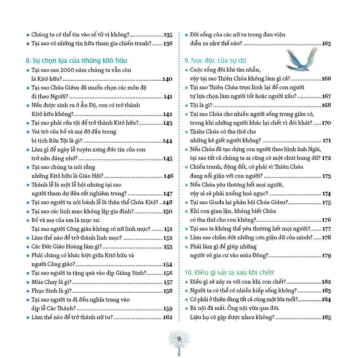 Ai đã trả lời các câu hỏi này? Đó là một nhóm gồm các bậc cha mẹ, nhà báo, linh mục. Những người này có rất nhiều kinh nghiệm nói chuyện với trẻ em về những thứ liên quan đến cuộc sống và đức tin. Họ trả lời rất nghiêm túc những câu hỏi mà các em đặt ra. Với sự kiên nhẫn, họ trả lời từng câu một. Đồng thời, họ cố gắng hiểu rõ điều mà mỗi em muốn hỏi. Để giúp các em hiểu rõ, họ sử dụng từ ngữ đơn giản, nhưng không bao giờ đánh lừa các em. Họ nói những gì họ tin, những gì họ biết, những gì họ khám phá trong cuộc sống, những gì đã giúp họ sống đến hôm nay. Đương nhiên, khi tất cả các câu hỏi này được trả lời thì cuốn sách trở nên dày cộm! Bởi vậy, các em không thể chỉ đọc nó một lần từ đầu đến cuối rồi thôi, nhưng phải đọc tới đọc lui. Các em dừng lại khi gặp câu hỏi mà mà chính các em thắc mắc. Hoặc một câu hỏi thú vị khác mà các em chưa từng nghĩ đến. Cứ như thế, qua từng trang sách, ngày này qua ngày khác, các em tiến tới. Các em sẽ khám phá ra những kho báu nhỏ thực sự quý giá giúp các em hiểu thấu các vấn đề, hoặc những sự giải thích khoa học và thú vị. Các em hãy giữ cuốn sách này bên cạnh mình để khám phá mỗi ngày một ý tưởng mới. Khi đêm về, các em thấy mình lớn lên và ước muốn tiến bước trong cuộc sống.