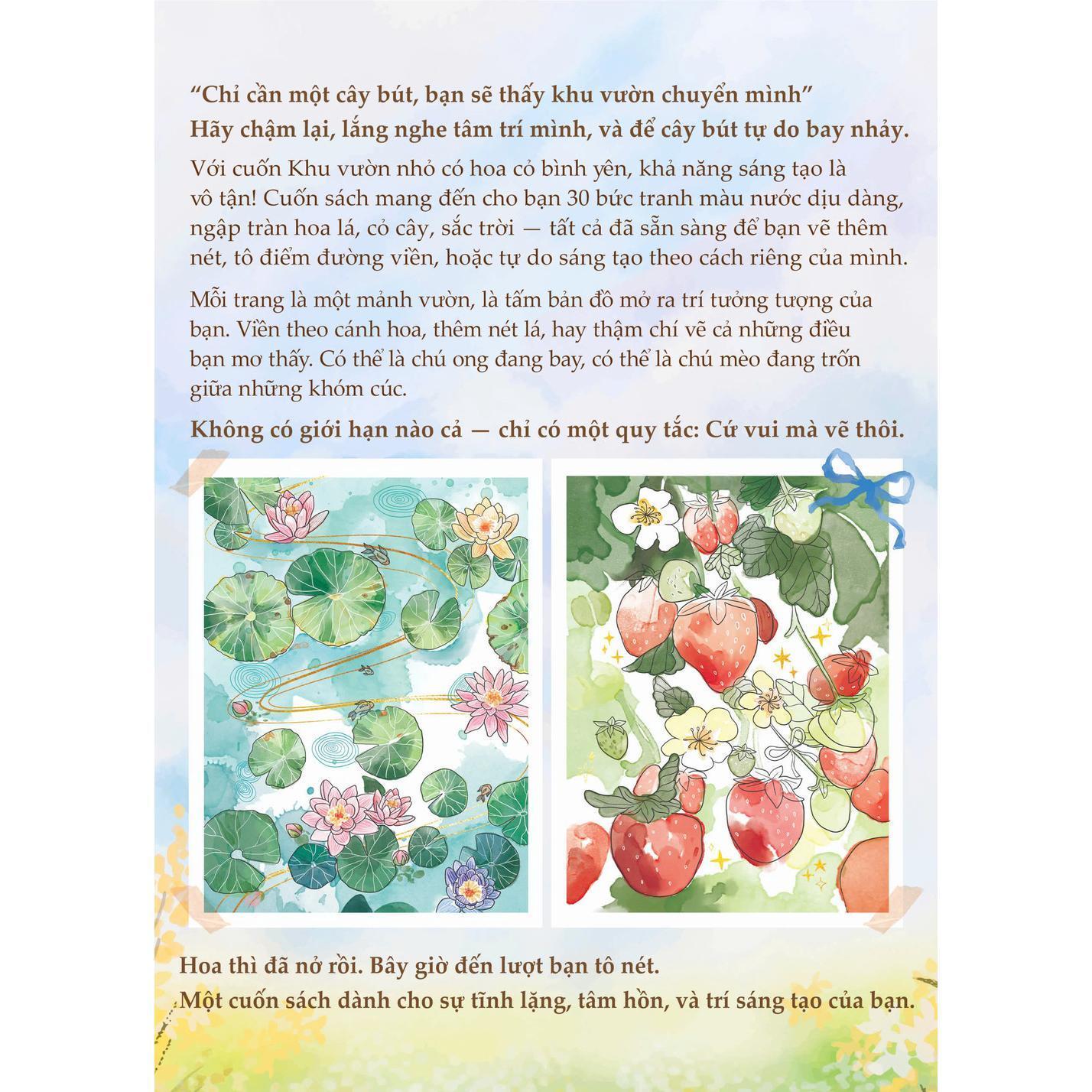 Khu vườn nhỏ có hoa cỏ bình yên là cuốn sách tô nét ngược gồm 30 bức tranh màu nước dịu dàng, tràn ngập hoa lá, cỏ cây và sắc trời. Mỗi bức tranh là một mảnh vườn mở ra trí tưởng tượng của bạn — nơi bạn có thể vẽ viền theo cánh hoa, thêm nét lá, hay vẽ nên điều bạn nhìn thấy qua bức tranh màu nước đó. Không có quy tắc, chỉ có tự do và cảm hứng. Đây là cuốn sách dành cho những phút giây tĩnh lặng, để bạn lắng nghe chính mình và nuôi dưỡng tâm hồn qua từng nét vẽ. Chỉ cần một cây bút, bạn sẽ thấy khu vườn chuyển mình.