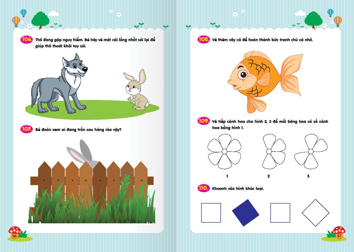 vẽ vui nhộn. Các bài tập, trò chơi kết hợp giữa rèn luyện tư duy với kiến thức tự nhiên và xã hội mà trẻ đã quen thuộc như: mê cung, ghép hình, tìm quy luật chung… phù hợp nhận thức của trẻ từ 3 - 6 tuổi giúp các bé rèn luyện và phát triển các kĩ năng cần thiết: quan sát, tưởng tượng, sáng tạo, ghi nhớ, tư duy logic và giải quyết vấn đề,…