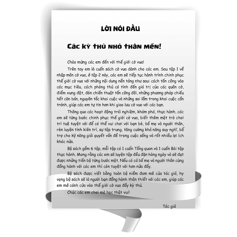 Mỗi tập sách có các bài học nhỏ, những bài thực hành và minigame vui vẻ, giúp các bạn nhỏ từng bước chinh phục thế giới cờ vua đầy kỳ thú. Đó là thế giới với những câu chuyện cổ tích về những nhà thông thái, câu chuyện về các huyền thoại cờ vua, các đại kiện tướng, các nhà vô địch, những cuộc giải cứu của các chiến binh, bắt pokemon, hái nấm trong rừng, thoát khỏi mê cung, đi tìm kho báu, những cuộc đua về đích, hái ngôi sao, bài test.