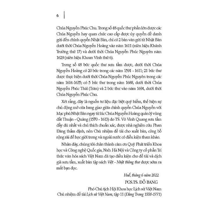 Mua tại TiktokSách - Việt Nhật Thông Thư - Các Bức Quốc Thư Bang Giao Giữa Chính Quyền Đàng Trong Với Nhật Bản Thế Kỷ XVI - XVII "Việt-Nhật thông thư" là một phần của Ngoại phiên thông thư được lưu trữ tại Nhật Bản. Đó là các quốc thư bang giao giữa Chúa Nguyễn ở Đàng Trong và Mạc phủ Nhật Bản trong thế kỷ XVI - XVII được TS. Võ Vinh Quang sưu tầm, giám định làm tư liệu để phục vụ cho đề tài Lịch sử Việt Nam, tập 11 (Đàng Trong 1558-1771), mã số KHXH-LSVN.11/14-18 của bộ Lịch sử Việt Nam do . Đỗ Bang làm chủ nhiệm và Hội Khoa học Lịch sử tỉnh Thừa Thiên Huế làm cơ quan chủ trì đề tài. Trong 79 quốc thư giao dịch giữa Chính quyền Đại Việt với Mạc phủ Nhật Bản, có đến 48 bức quốc thư của chính quyền Chúa Nguyễn ở Đàng Trong.