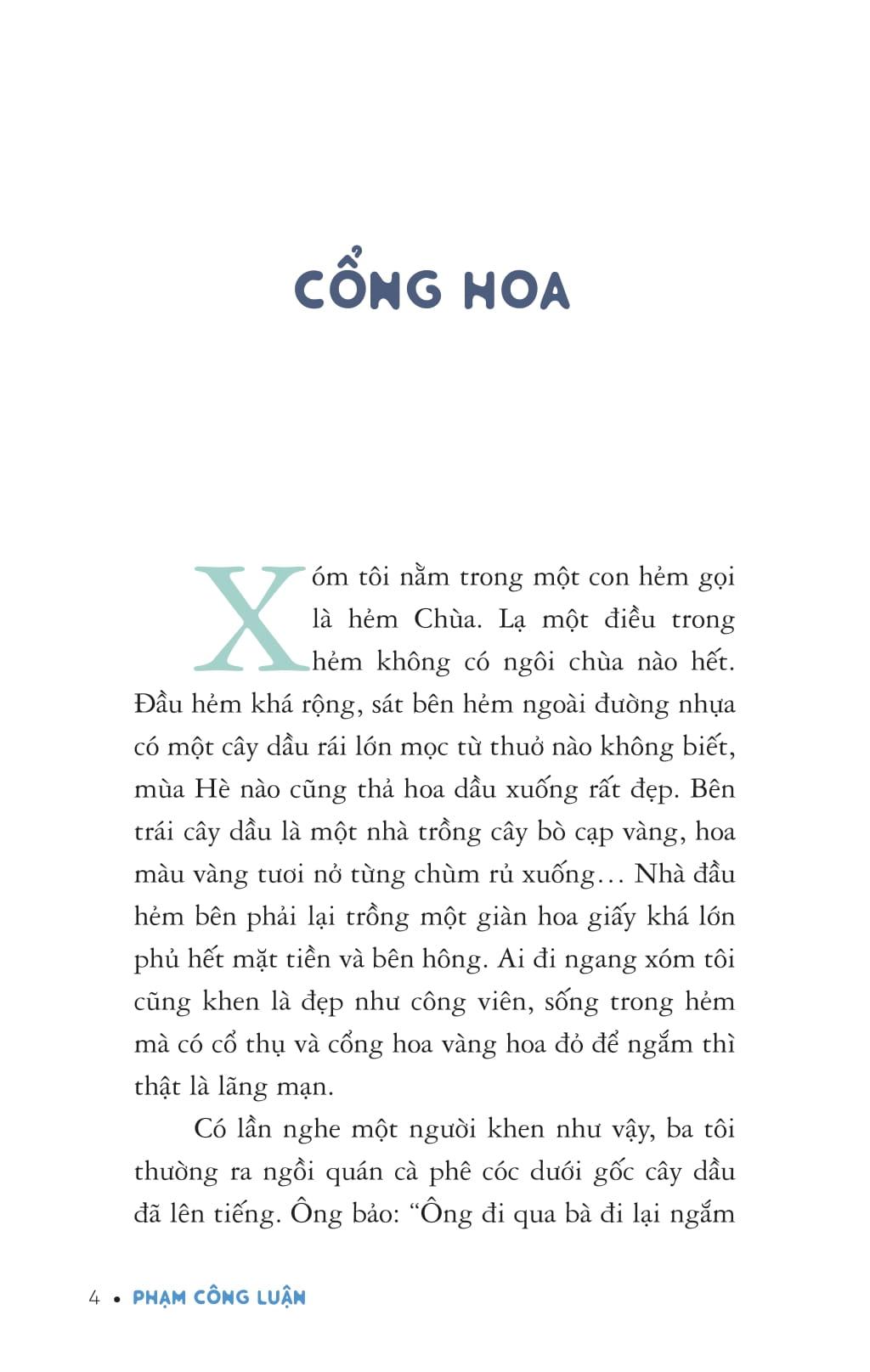 “Hoa lá quanh đây hình như đã góp phần tạo nên tính cách hiền hậu và mơ mộng của ba tôi. Đó là lí do ông yêu thương cái xóm nhỏ với những cây xanh mà cả xóm đồng lòng gìn giữ.”(Trích “Xóm thiên đường”)