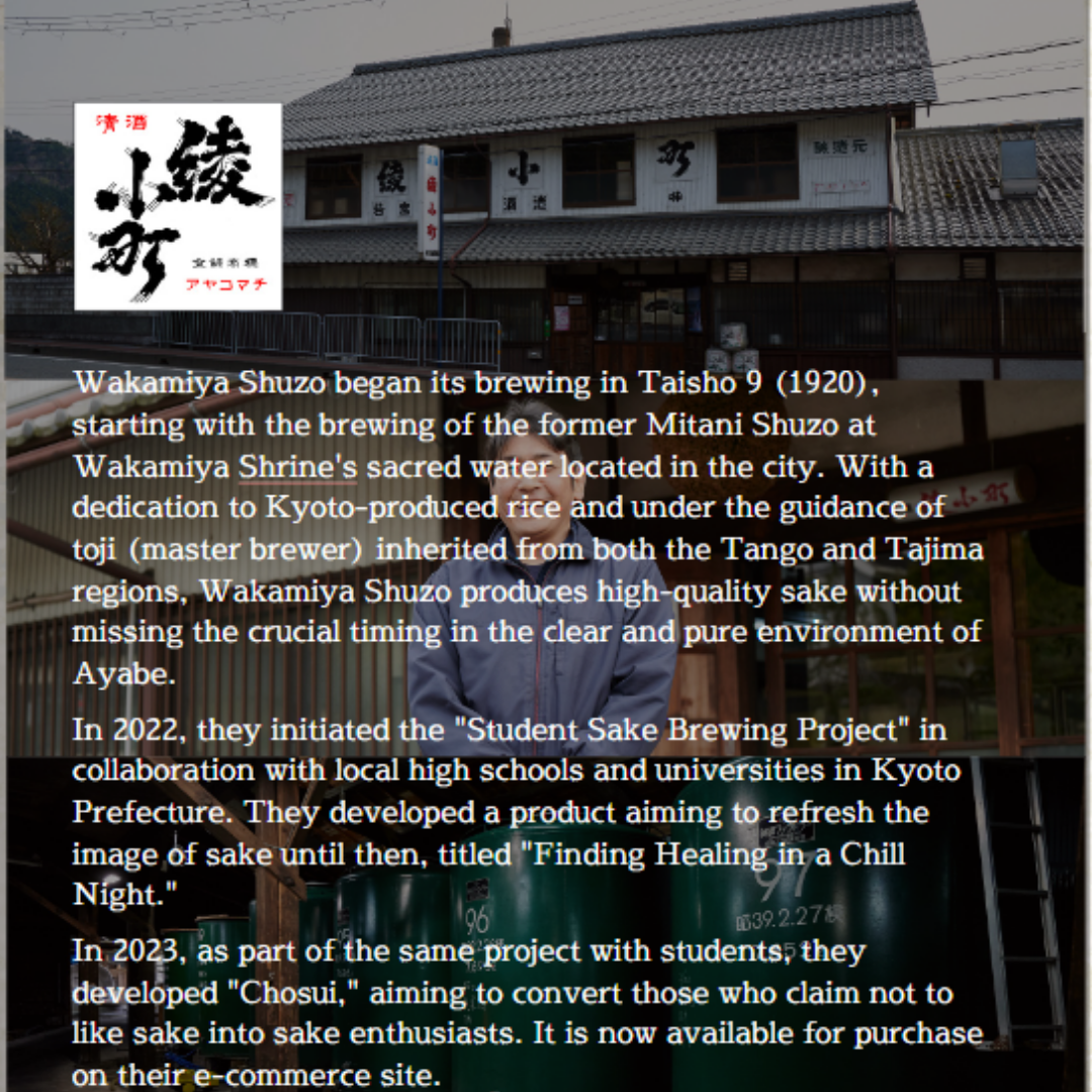 Chorou Tan Junmai Ginjo Với hương vị mịn, nhẹ. Rượu sake `` Chourou Tan '' được làm hoàn toàn từ gạo, nước, nhà máy rượu sake và nhà sản xuất bia của Kyotanba, đồng thời