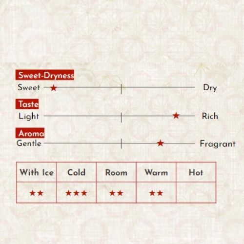 Được ủ trong thùng gỗ tuyết tùng ngay trước khi đóng chai, loại rượu Sake Taru ("thùng") này bùng nổ với hương vị nồng nàn và đặc sắc. Có vị cay và hương thơm thảo