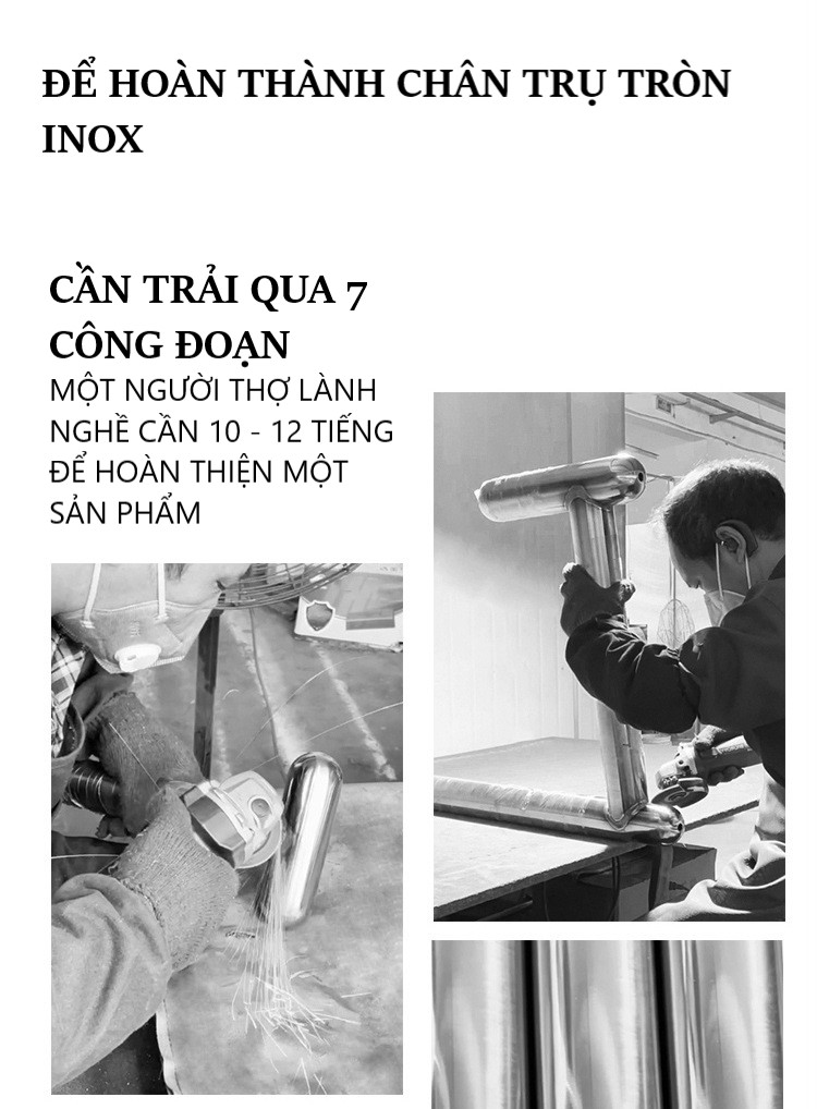 1. Mô tả sản phẩm: Được làm từ khung Inox 304 (không sét rỉ bền bỉ với thời gian, không như Inox 201 nổi chấm vàng sau một thời gian); Để chân trụ tròn đẹp
