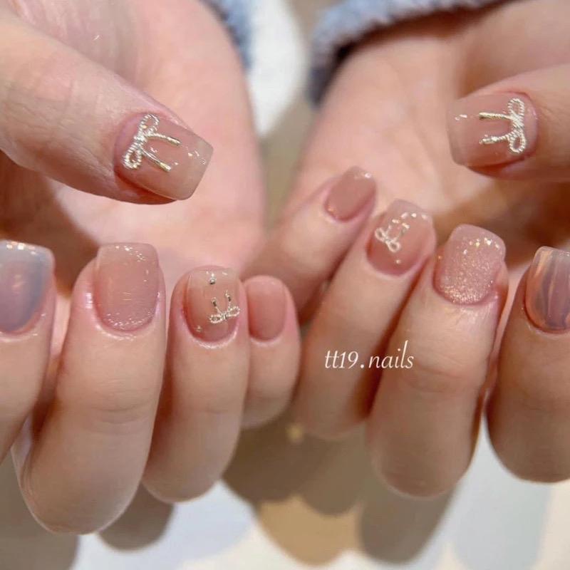 - Sơn lớp bảo vệ:Sơn lớp top coat để cố định charm và tăng độ bóng. [Hình ảnh: Các mẫu nail đẹp được trang trí bằng charm nơ bạc] Lưu ý: