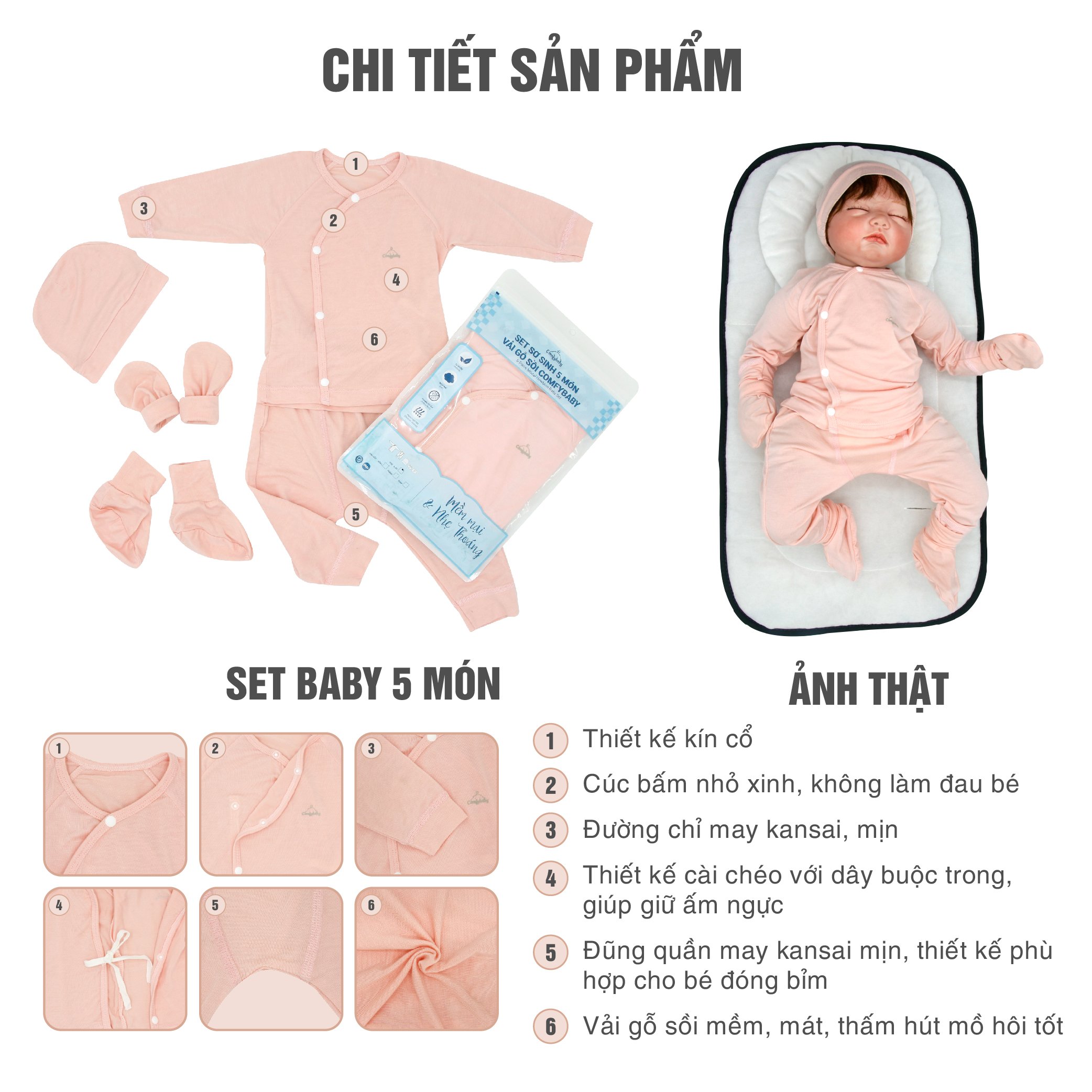 MÔ TẢ SẢN PHẨM Mẹ có biết da trẻ sơ sinh mỏng hơn đến 5 lần so với da người lớn, lại vô cùng “khó chiều”? Bộ quần áo sơ sinh 5 chi tiết Comfybaby