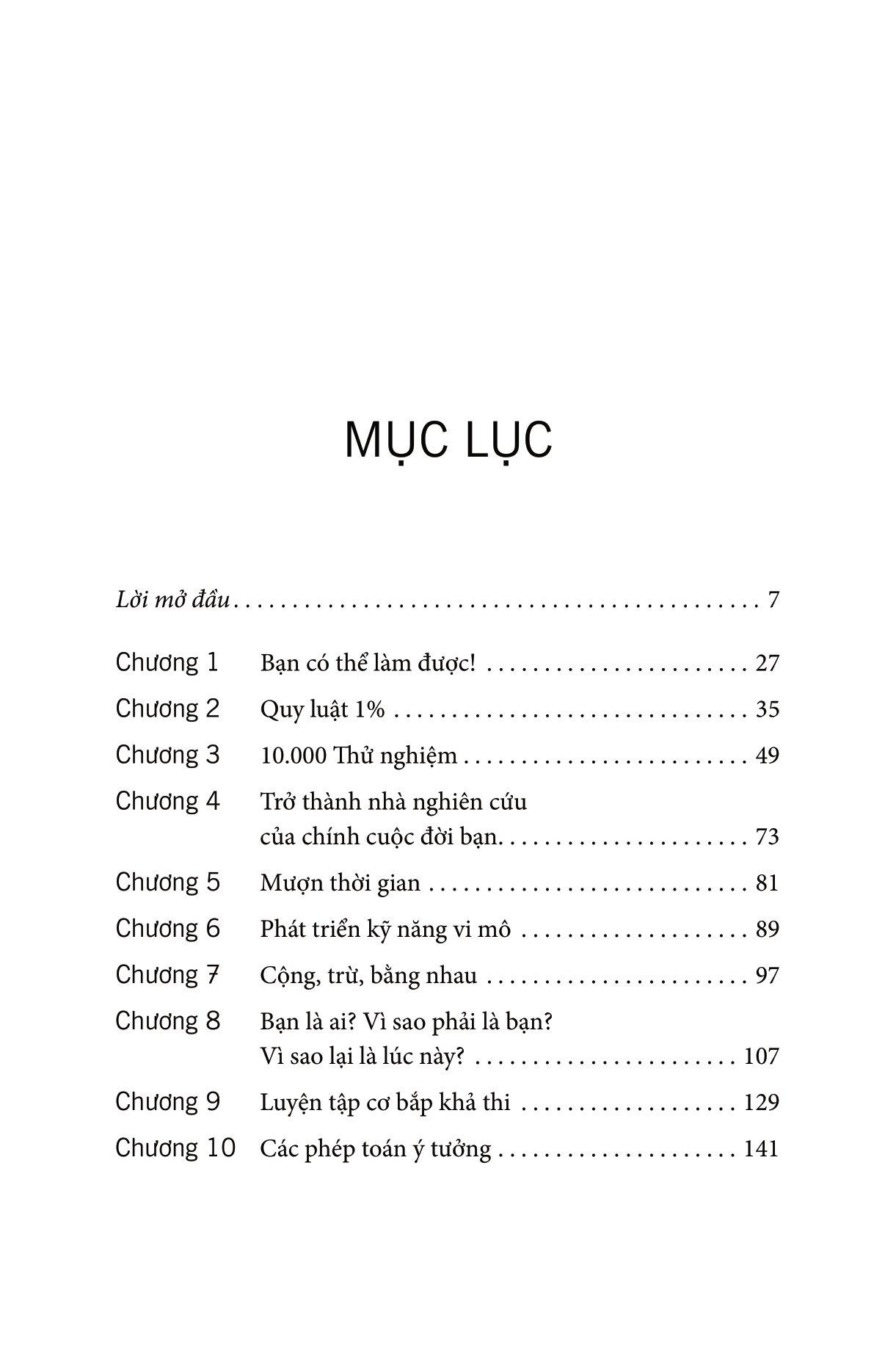 Khi bạn sử dụng Quy tắc 1% và các công cụ trong cuốn sách này (ví dụ như Quy tắc tăng hiệu suất 50/1, các kỹ thuật về phép toán ý tưởng và kiểm soát tình thế), bạn sẽ nhận ra rằng bạn có lượng thời gian gần như vô hạn để làm nên những tiến bộ 1% mỗi ngày trong cuộc sống của m.ình.