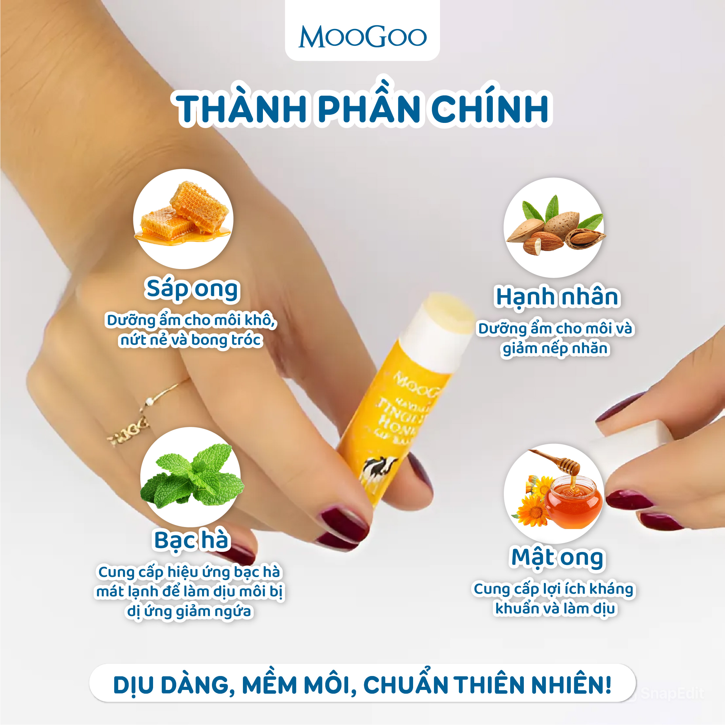 Son dưỡng môi MooGoo với các thành phần từ thiên nhiên thuần khiết, chăm sóc hằng ngày cho  đôi môi mềm mại và mịn màng. ✓ Thành phần tốt cho sức khỏe ✓ Có chứa
