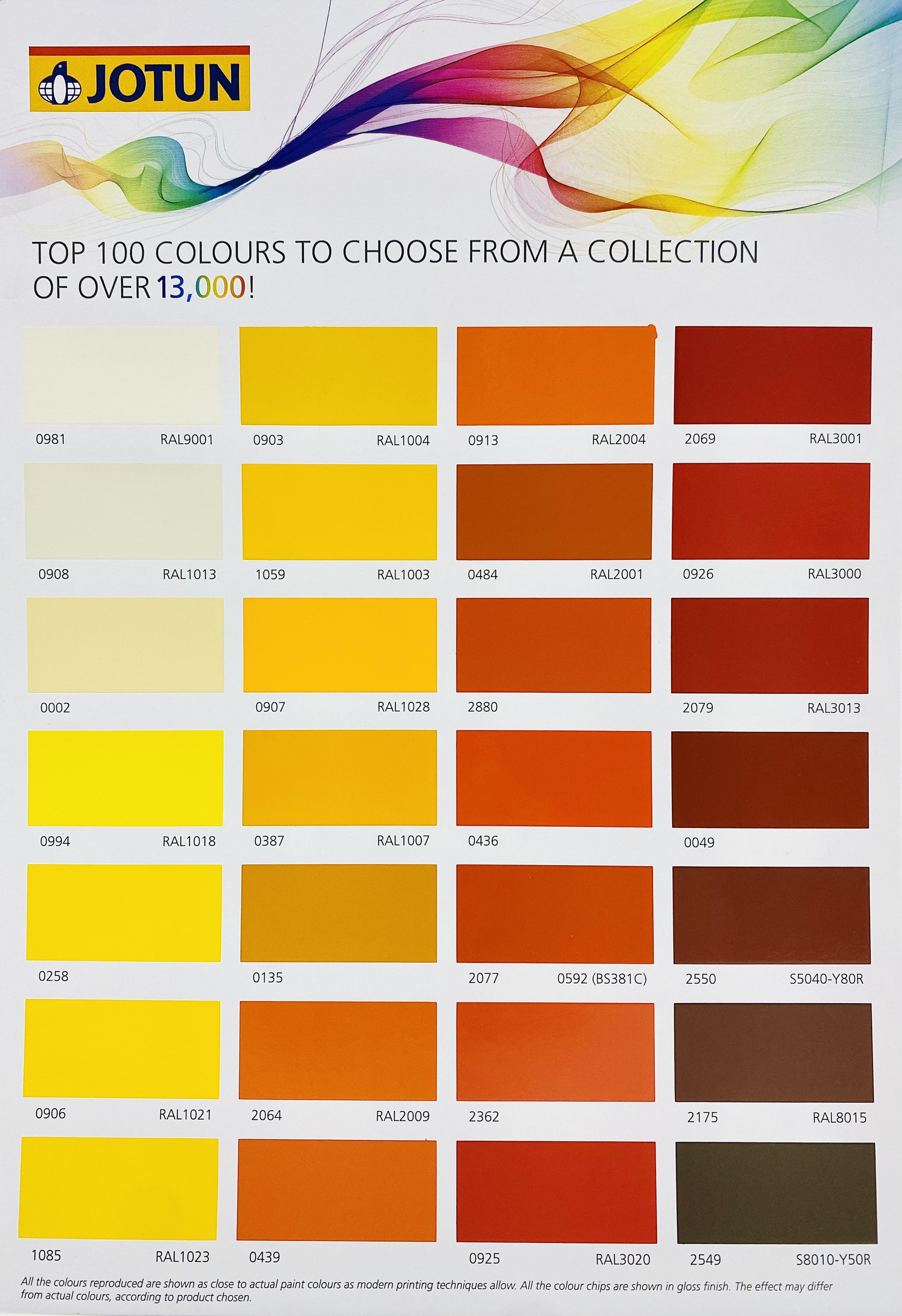 Màu sắc sơn công nghiệp Jotun : Theo bảng màu và hệ thống pha sơn công nghiệp tự động (MCI) Ivory White 566, Yellow 414, Orange 436, Yellow 258, Red 926 (Ral 3000), Ral 1004, Red 49, White 0001, Black 0099, Ral 3013, Tomato Red 2079, Ral 2001, Yellow 2, Green 137, Signal Green 7075, Ral 6032, Green 431, Green 437, Blue 139, Blue 599, Blue 129, Grey 38, grey 136, Grey 403, Light grey 967, Ral 7035, Grey 433, Grey 149, Grey 456, Ral 7000, Ral 5002, Ral 5005, Ral 6000, Ral 6001, Ral 6011, Ral 1003, Ral 1015, Ral 3020, Ral 8017, Ral 9001…