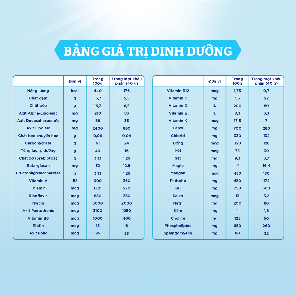 - Không đường sucrose, vị thanh nhạt dễ uống THÀNH PHẦN Lactose, bột sữa gầy, maltodextrin, hỗn hợp dầu thực vật (dầu cọ olein, dầu dừa, dầu đậu nành và dầu hướng dương), đạm whey protein cô đặc^, khoáng chất (kali citrat, canxi phosphat dibasic, canxi carbonat, natri citrat, tricanxi phosphat, kali clorid, magnesi phosphat, kali hydroxyd, sắt sulfat, kẽm sulfat, mangan sulfat, đồng sulfat, natri iodid, natri selenit), oligofructose, chất nhũ hóa (lecithin đậu nành), dầu cá như một nguồn cung cấp axit docosahexaenoic (DHA), si-rô bắp, vitamin (choline clorid, alpha-tocopheryl acetat, natri ascorbat, axit ascorbic, niacinamid, retinyl palmitat, canxi pantothenat, cholecalciferol, pyridoxin hydrochlorid, phytonadion, thiamin hydrochlorid, cyanocobalamin, riboflavin, axit folic, biotin), beta-glucan chiết xuất từ men làm bánh và chất chống oxy hóa (ascorbyl palmitat).
