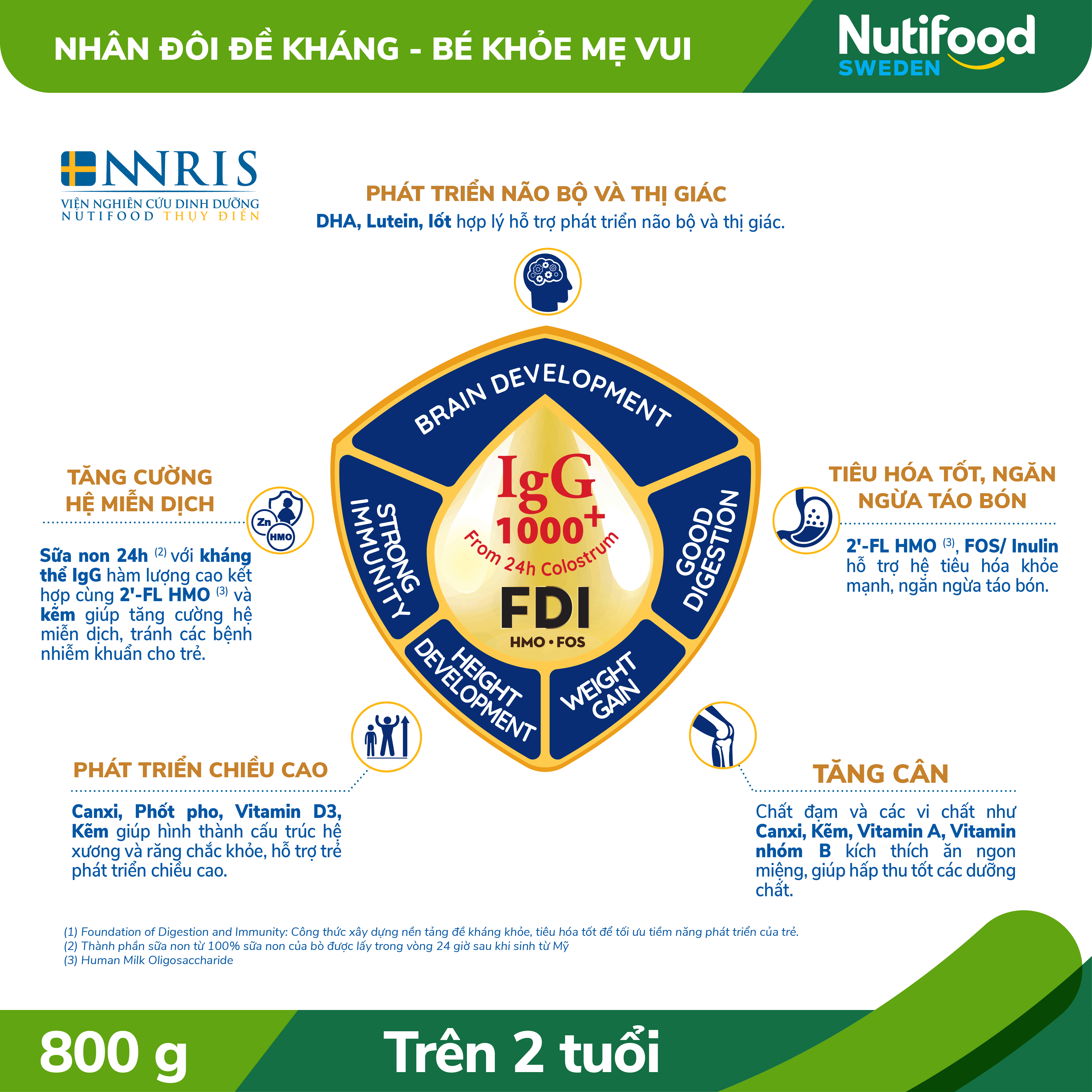 Sản phẩm này không phải là thuốc, không có tác dụng thay thế thuốc chữa bệnh Nutifood Sweden GrowPLUS+ Sữa non là thương hiệu của Nutifood Thụy Điển với công thức được phát triển bởi Viện nghiên cứu dinh dưỡng Nutifood Thụy Điển (NNRIS), xây dựng nền tảng FDI hỗ trợ Đề kháng khỏe, tiêu hóa tốt, giúp chuyển hóa tốt các dưỡng chất. Nay bổ sung 100% Sữa non 24h tự nhiên từ Mỹ với hàm lượng cao kháng thể IgG 1000 mg cùng 2'-FL HMO giúp tăng cường đề kháng, cho bé phát triển khỏe mạnh.. Sản phẩm được sản xuất tại Singapore dưới sự giám sát và tiêu chuẩn chất lượng cao nghiêm ngặt của Nutifood Thụy Điển.    THÔNG TIN CHI TIẾT:  LỢI ÍCH SẢN PHẨM HỖ TRỢ PHÁT TRIỂN NÃO BỘ VÀ THỊ GIÁC Hàm lượng DHA, Lutein, lod hợp lý hỗ trợ phát triển não bộ và thị giác. HỖ TRỢ TĂNG CƯỜNG SỨC ĐỀ KHÁNG Thành phần đột phá Sữa non 24h ≈ với kháng thể IgG hàm lượng cao kết hợp cùng 2-FL HMO và Kẽm giúp tăng cường đề kháng.  HỖ TRỢ TIÊU HÓA KHỎE MẠNH 2-FL HMO cùng chất xơ hòa tan FOS, Inulin giúp kích thích hoạt động của các lợi khuẩn trong đường ruột, hỗ trợ hệ tiêu hóa khỏe mạnh.  HỖ TRỢ PHÁT TRIỂN CÂN NẶNG Sắt và Kẽm giúp trẻ ăn ngon miệng, hỗ trợ tăng cân. Bổ sung Lysin giúp cải thiện tình trạng dinh dưỡng và cẩn nặng ở trẻ.  HỖ TRỢ PHÁT TRIỂN CHIỀU CAO Calci, Vitamin D3 giúp tăng mật độ khoảng xương cùng Kẽm hỗ trợ phát triển chiều cao cho trẻ.    Thành phần: Sữa bột nguyên kem, bột sữa (bột whey, sữa bột, dầu thực vật (dầu hạt cải, dầu bắp, dầu dừa, dầu hướng dương), lactose, inositol, taurin), maltodextrin, đường, sữa non (colostrum) (5 %), chất xơ thực phẩm (FOS, Inulin), vitamin và khoáng chất (magnesi clorid, kali clorid, kali citrat, natri citrat, riboflavin, kali hydro phosphat, calci carbonat, natri hydro phosphat, natri clorid, magnesi oxyd, sắt pyrophosphat, natri L-ascorbat, kẽm sulphat, mangan sulphat, DL-alpha-tocopheryl acetat, natri selenit, dong sulphat, cholecalciferol, niacinamid, retinyl acetat, calci D-pantothenat, acid folic, kali iodid, D-biotin, phylloquinon, cyanocobalamin, pyridoxin hydroclorid, thiamin mononitrat, kem oxyd, L-carnitin tartrat, thiamin hydroclorid), acid docosahexaenoic (DHA, từr dầu cá), hương liệu tổng hợp, cholin bitartrat, 2'-Fucosyllactose (2'-FL), lutein, probiotics (Bifidobacterium lactis). Có chứa sữa, đậu nành, dầu cá.    Hướng dẫn bảo quản: Đóng kín nắp lon sau khi sử dụng và để nơi khô ráo thoáng mát, tránh ánh nắng trực tiếp, không lưu trữ trong tủ lạnh. Nên dùng sản phẩm trước hạn sử dụng và sử dụng hết trong vòng 1 tháng sau khi mở nắp lon.  Đối tượng sử dụng: Dành cho trẻ trên 2 tuổi HƯỚNG DẪN SỬ DỤNG