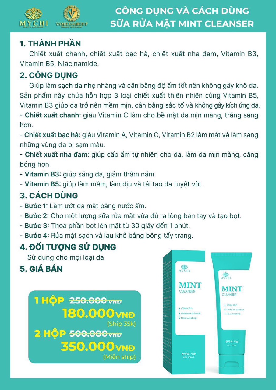 - Sữa Rửa Mặt Mint Cleanser Mychi là sản phẩm làm sạch da vô cùng dịu nhẹ, an toàn, dùng được cho da nhạy cảm đến từ Mỹ phẩm Mychi