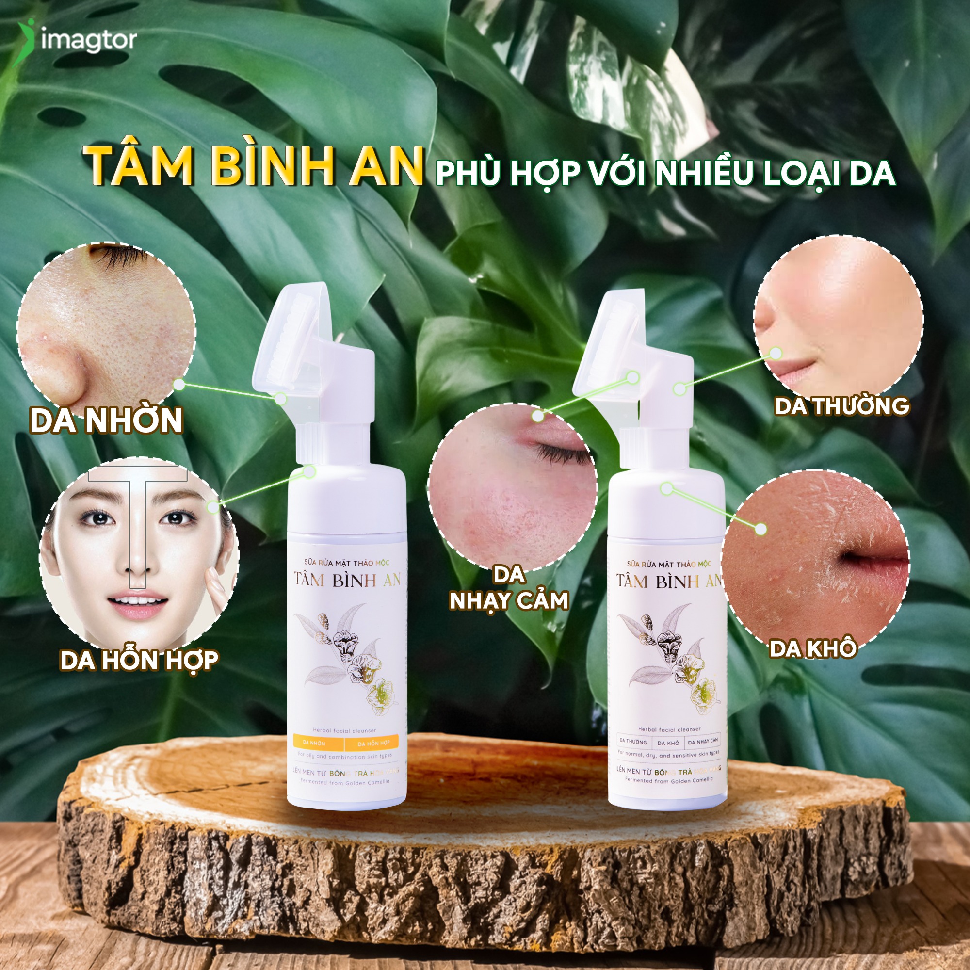 Mua tại TiktokMô tả: Sữa rửa mặt thảo mộc Tâm Bình An gồm các thành phần chủ yếu từ thiên nhiên, chiết xuất từ Trà Hoa Vàng mang tới các công dụng như làm sạch sâu, làm thông thoáng lỗ chân lông, duy trì độ ẩm tự nhiên cho da, chống oxy hóa vượt trội giúp ngăn ngừa mụn trên da, giúp da luôn tươi sáng và mềm mại. Dung tích: 150ml Ưu điểm: An toàn cho da: Đã được kiểm nghiệm da liễu Không chứa hóa chất độc hại, an toàn cho mọi loại da, kể cả da nhạy cảm. Làm sạch cho da hiệu quả: Loại bỏ bụi bẩn, bã nhờn và tế bào chết trên da giúp da thông thoáng và khỏe mạnh. Kích thích sản sinh collagen, giúp da săn chắc, trẻ trung và đàn hồi. Cấp ẩm và dưỡng da mềm mại: Nhờ chiết xuất từ Trà Hoa Vàng giàu vitamin, khoáng chất và các hợp chất chống oxy hóa, giúp nuôi dưỡng da từ sâu bên trong. Kiểm soát dầu nhờn: Loại bỏ bã nhờn dư thừa trên da, giúp da thông thoáng, ngăn ngừa mụn trứng cá. Thiết kế đầu rửa tạo bọt silicon giúp matxa da mặt, tạo bọt giúp thẩm thấu cho da tốt hơn, tiện lợi, dễ dàng tháo rời vệ sinh. Thành phần: Purified Water, Camellia Chrysantha (Trà Hoa Vàng), Perilla Frutescens Leaf Extract (Chiết xuất Lá Tía Tô), Lactuca indica Root Extract (Chiết xuất Rễ Bồ Công Anh), Saccharomyces/Rice Bran Ferment (Nguyên liệu lên men từ mầm cám Gạo), Ananas Sativus (Pineapple) Fruit Extract (Chiết xuất quả Dứa), Aqua (and) Disodium Cocoyl Glutamate (and) Sodium Cocoyl Glutamate, Hydrolyzed Yeast Protein, Glycerin, Tocopheryl Acetate (Vitamin E), PEG-40 Hydrogenated Castor Oil, Phenoxyethanol (and) Ethylhexylglycerin, Allantoin, Fragrance (Santal 33). KHÔNG CHỨA: SILICON, PARABEN, MÀU TỔNG HỢP, CHẤT CẤM, HÓA CHẤT, MÀI MÒN DA, GÂY TÁC DỤNG PHỤ. Công nghệ lên men tự nhiên giữ dưỡng chất mang lại hiệu quả rõ rệt sau 1-2 tuần sử dụng Công dụng: