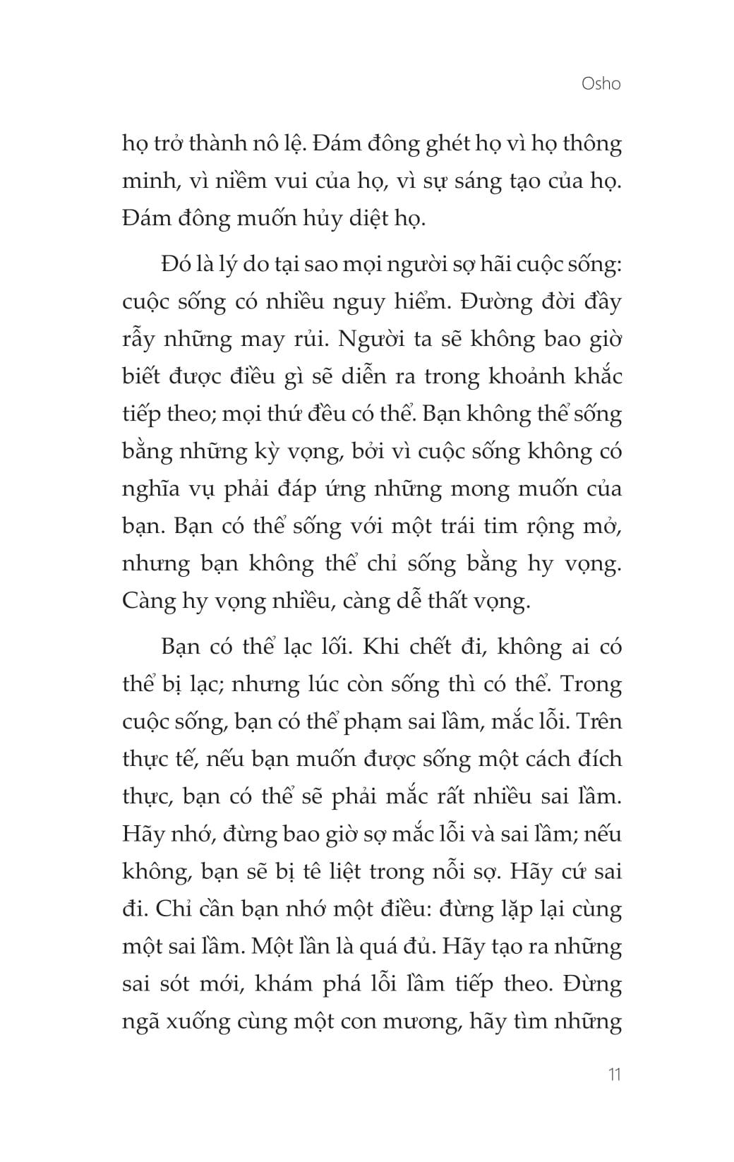 Đường đời đầy rẫy những may rủi. Người ta sẽ không bao giờ biết được điều gì sẽ diễn ra trong khoảnh khắc tiếp theo; mọi thứ đều có thể. Bạn không thể sống bằng những kỳ vọng, bởi vì cuộc sống không có nghĩa vụ phải đáp ứng những mong muốn của bạn. Bạn có thể sống với một trái tim rộng mở, nhưng bạn không thể chỉ sống bằng hy vọng. Càng hy vọng nhiều, càng dễ thất vọng. Trong cuộc sống, bạn có thể phạm sai lầm, mắc lỗi. Trên thực tế, nếu bạn muốn được sống một cách đích thực, bạn có thể sẽ phải mắc rất nhiều sai lầm. Hãy nhớ, đừng bao giờ sợ mắc lỗi và sai lầm; nếu không, bạn sẽ bị tê liệt trong nỗi sợ. Hãy cứ sai đi. Chỉ cần bạn nhớ một điều: đừng lặp lại cùng một sai lầm. Một lần là quá đủ. Hãy tạo ra những sai sót mới, khám phá lỗi lầm tiếp theo. Bằng việc phạm lỗi, lạc lối, bạn sẽ trưởng thành. Đó là con đường duy nhất để trưởng thành.