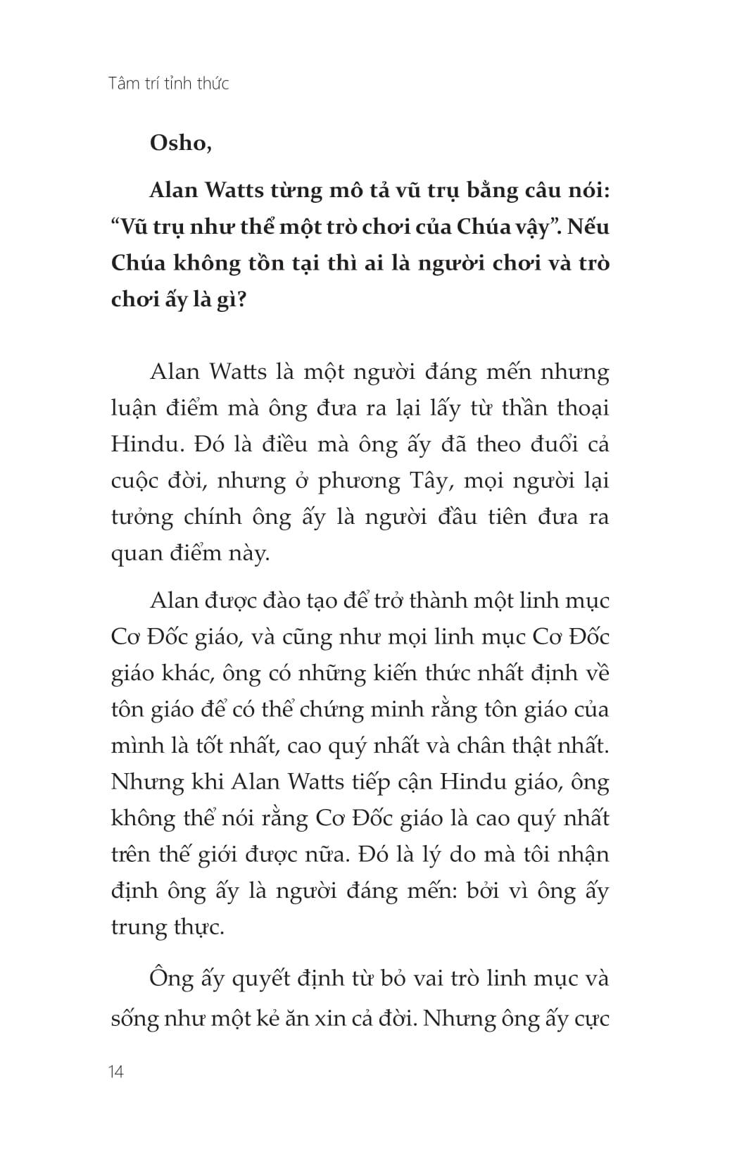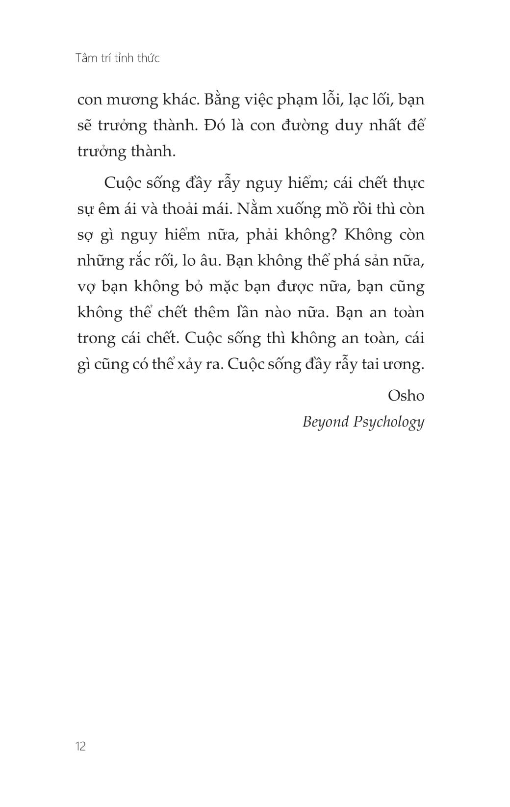 Với “Tâm trí tỉnh thức”, bạn sẽ hiểu được chân lý của Osho: Khi bạn sống đích thực và chân thành, hãy sống một cuộc đời theo cách của bạn, dưới ánh sáng của chính bạn, không phụ thuộc vào kế hoạch mà người khác lập cho bạn. Khi bạn đang vận động mỗi ngày để tiến đến một nơi vô định mà không có ý niệm về điều sẽ xảy ra, với sự sáng tạo, nhạy cảm, nhận thức tuyệt vời, nhưng không chấp nhận một hệ tư tưởng cố định; khi bạn đang khám phá những thảo nguyên mới mẻ, những đỉnh cao mới trong cuộc sống thì chắc chắn bạn không còn là một phần của đám đông nữa.