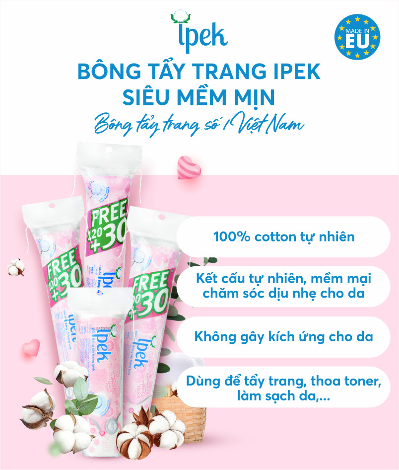 - Combo Bông Tẩy Trang Ipek 130 Miếng (Thổ Nhĩ Kỳ) thành phần 100% bông cotton là bông tẩy trang hữu cơ được sản xuất bởi công ty Ipek Idrofil Pamuk công ty hàng đầu
