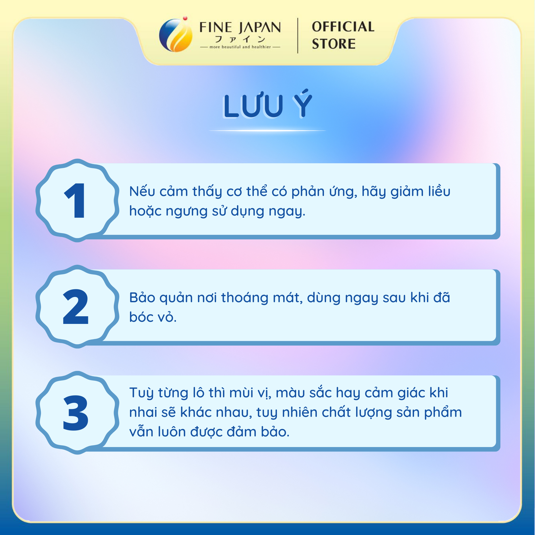 - Tuỳ từng lô thì mùi vị, màu sắc hay cảm giác khi nhai sẽ khác nhau, tuy nhiên chất lượng sản phẩm vẫn luôn được đảm bảo.