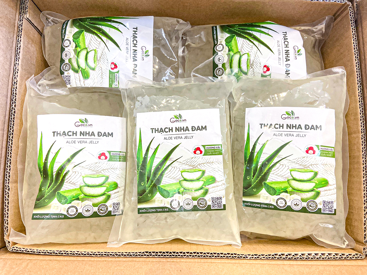 THÔNG TIN SẢN PHẨM THẠCH NHA ĐAM - Khối lượng: 1 kg - Thành phần: Nha đam (≥ 60%), đường (≥ 12%), nước, hương vải thực phẩm,... - Xuất xứ: Việt Nam. - NSX và
