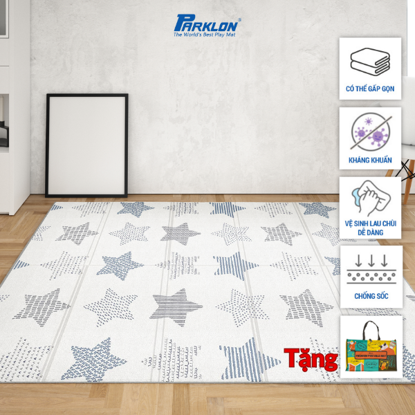 Mua tại TiktokThảm Trẻ Em Hàng Đầu Thế Giới Nhập Khẩu Chính Hãng Hàn Quốc Parklon Thương hiệu: Parklon Xuất xứ: Hàn Quốc Chất liệu: Nhựa PVC Họa tiết: Chòm sao lấp lánh Kích thước: 200cm x 140cm x 0.8cm Độ bền: 10 năm Sau thời gian tung tăng, bé yêu dễ dàng xếp gọn chiếc thảm và cất đi. Trọng lượng thảm chỉ 200g vô cùng nhẹ nhàng. Bề mặt của thảm chống trơn trượt, không bám bẩn và hoàn toàn không thấm nước nên có thể dễ dàng làm sạch với khăn ướt. Giữ không gian sạch sẽ và an toàn cho các bé. Lỡ tung tăng quá đà, ngã cũng không sao. Độ dày của thảm lên đến 1,2 cm, độ ma sát cao và cực kỳ êm ái. Bảo vệ trẻ khỏi những tổn thương do té ngã. Ngoài ra, nhờ độ êm ái, thảm làm giảm 50% tiếng ồn từ các tác động lên mặt sàn. Giúp các bé có thể vui chơi thỏa thích. THẢM TRẺ EM HÀNG ĐẦU THẾ GIỚI CHÍNH HÃNG PARKLON: Bảo vệ con bạn khỏi sàn nhà cứng khi các bé tập bò, tập đứng hay tập đi. Thảm trẻ em Parklon được thiết kế đặc biệt để hấp thụ tác động và mang lại sự thoải mái hàng giờ cho các bé. ★ Chất liệu cao cấp được nhập khẩu từ Đức, kết hợp với công nghệ tiên tiến nhất của Parklon để tạo nên những chiếc thảm trẻ em hoàn hảo nhất. ★ Công nghệ chống sốc, chống va đập và giảm tiếng ồn được cải tiến giúp trẻ thoải mái vui chơi. ★ Thiết kế 2 mặt với hoa văn đặc biệt chống trơn trượt và công nghệ bo góc đặc biệt không gây nguy hiểm cho bé. ★ Công nghệ Nano kháng khuẩn quanh năm, không gây dị ứng, an toàn ngay cả với làn da của trẻ sơ sinh. ★ Khả năng chống nước 100% và dễ dàng vệ sinh, chỉ cần lau sạch vết bẩn bằng khăn. ★ Bề mặt thảm mềm mại, êm ái kết hợp cùng chất liệu đặc biệt giúp giữ ấm vào mùa đông, không nóng vào mùa hè. ★ Chất liệu thân thiện với môi trường, không chứa các chất độc hại và kim loại nặng. ★ Đạt chứng nhận an toàn từ tổ chức toàn cầu: KC, SGS, ISO 9001, An toàn Châu Âu EN71
