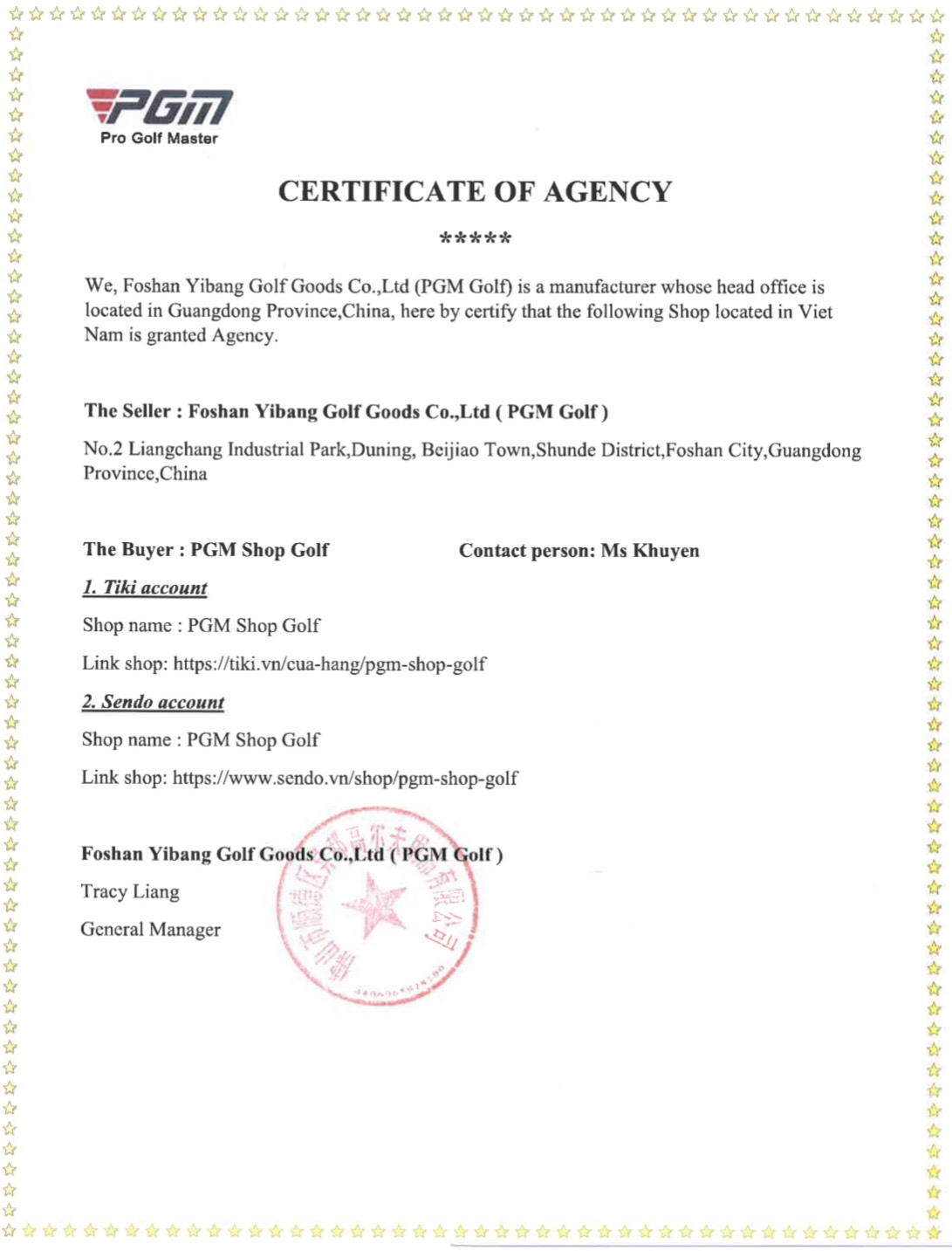PGM Shop Golf rất vinh dự được Tổng quản lý Ms.Tracy đại diện cho công ty Foshan Yibang Golf Goods Co.,Ltd (PGM Golf) tại Trung Quốc cấp chứng nhận Đại lý bán hàng chính hãng PGM tại Việt Nam. PGM Shop Golf luôn hướng tới mục tiêu mang những sản phẩm chất lượng tốt nhất với giá thành hợp lý nhất tới khách hàng.