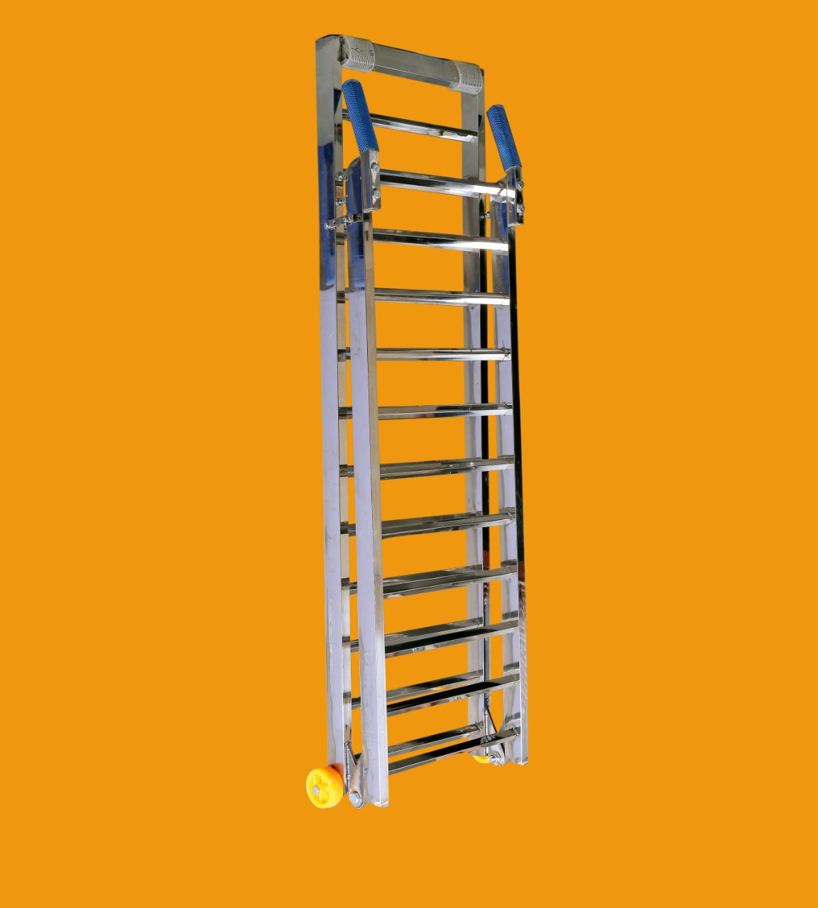 THANG ĐI XE MÁY INOX KAOA . RỄ DÀNG CHO TRẺ NHỎ ĐẾN NGƯỜI GIÀ CÓ THỂ CẦM HOẶC DI CHUYỂN BẰNG BÁNH XE RA .VÀO MỘT CÁCH NHẸ NHÀNG