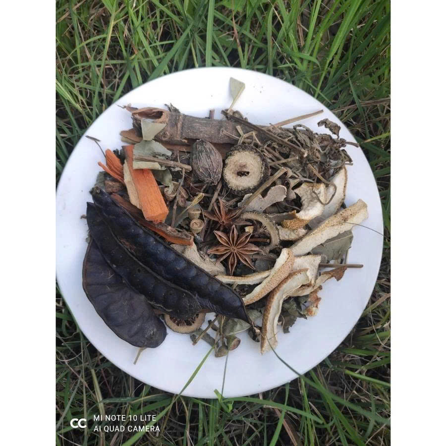 - Gói thảo dược xông nhà được làm từ 100% nguyên liệu thiên nhiên như , đinh hương , hồi , sả, quế, trầm hương, vỏ bưởi, ,...