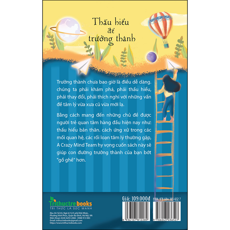 Thấu hiểu những vấn đề tâm lý và để chia sẻ với nhu cầu phát triển bản thân theo hướng tích cực, lành mạnh của các bạn trẻ - lứa tuổi đang chập chững trưởng thành, A Crazy Mind team đã cho ra đời Thấu hiểu để trưởng thành - Chưa đủ thấu hiểu, chẳng thể an nhiên. Với ba chương Thấu hiểu về bản thân; Thấu hiểu về các mối quan hệ; Hiểu biết về một số rối loạn và cách vượt qua chúng, Thấu hiểu để trưởng thành sẽ giúp bạn khám phá bản thân, khám phá cuộc sống với những góc nhìn đa chiều, sâu sắc hơn, có được những công cụ, kỹ năng để khám phá vùng đất mang tên “Trưởng thành”.