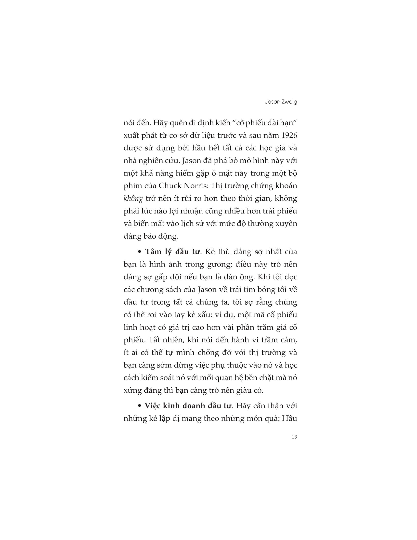 Jason Zweig là người phụ trách chuyên mục đầu tư và tài chính cá nhân của The Wall Street Journal. Trước đây, ông là cây viết cấp cao của tạp chí Money, biên tập viên quỹ tương hỗ tại tạp chí Forbes, và là khách mời của chuyên mục Time and . Ông là người biên tập ấn bản sửa đổi của cuốn “Nhà đầu tư thông minh” của Benjamin Graham, văn bản kinh điển mà Warren Buffett gọi là "cuốn sách hay nhất về đầu tư từng được viết cho đến nay." Ông cũng là tác giả của “Từ điển tài chính của quỷ”, một bảng chú giải châm biếm các thuật ngữ của Phố Wall, và “Tiền và bộ não của bạn”, về khoa học thần kinh và tâm lý học trong quá trình ra quyết định tài chính. Zweig làm việc trong ban biên tập của tạp chí Lịch sử Tài chính và Tạp chí Tài chính Hành vi.