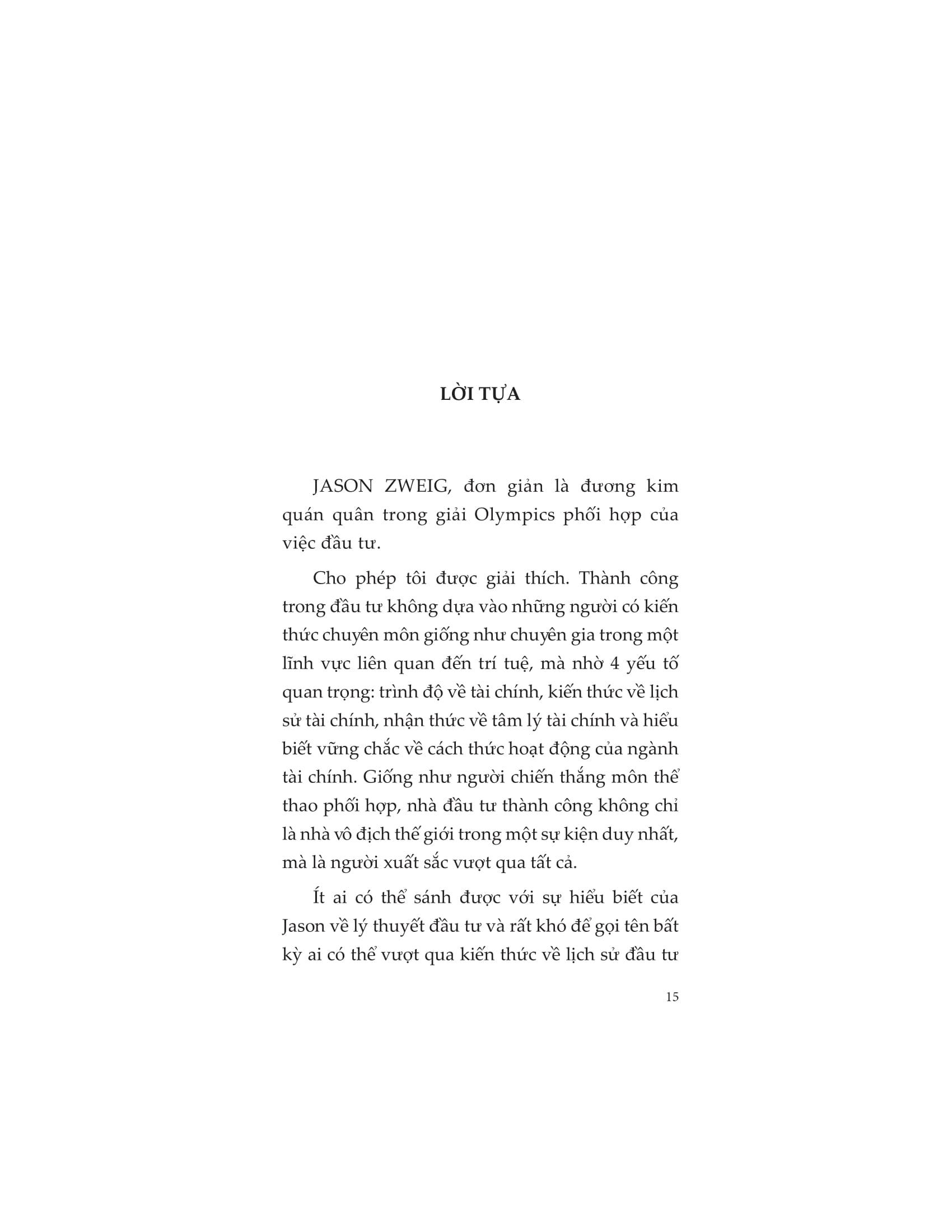 Thành công trong đầu tư không dựa vào những người có kiến thức chuyên môn giống như chuyên gia trong một lĩnh vực liên quan đến trí tuệ, mà nhờ 4 yếu tố quan trọng: trình độ về tài chính, kiến thức về lịch sử tài chính, nhận thức về tâm lý tài chính và hiểu biết vững chắc về cách thức hoạt động của ngành tài chính. Giống như người chiến thắng môn thể thao phối hợp, nhà đầu tư thành công không chỉ là nhà vô địch thế giới trong một sự kiện duy nhất, mà là người xuất sắc vượt qua tất cả.
