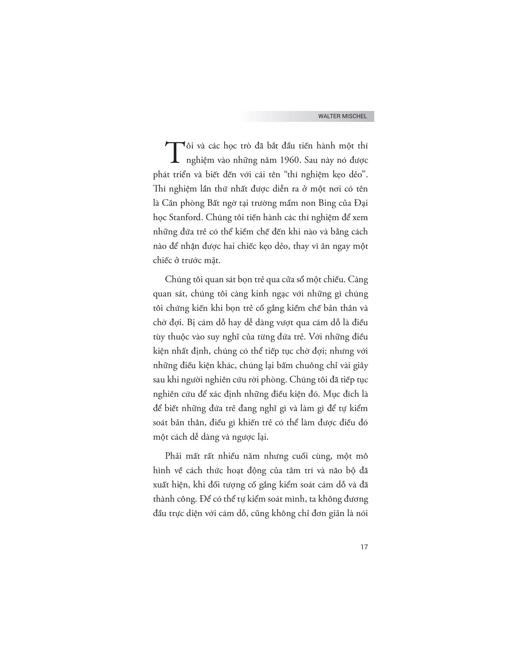 Tác giả Walter Mischel đi sâu vào phân tích các chiến lược và phương pháp giúp cải thiện khả năng tự kiểm soát, từ việc xây dựng ý chí mạnh mẽ đến việc áp dụng các chiến lược tinh thần để đối phó với cám dỗ và duy trì kiên nhẫn. Bên cạnh đó, tác giả cũng chỉ ra những yếu tố ảnh hưởng đến ý chí và sự kiểm soát bản thân, từ môi trường, cách giáo dục đến các yếu tố tâm lý cá nhân.