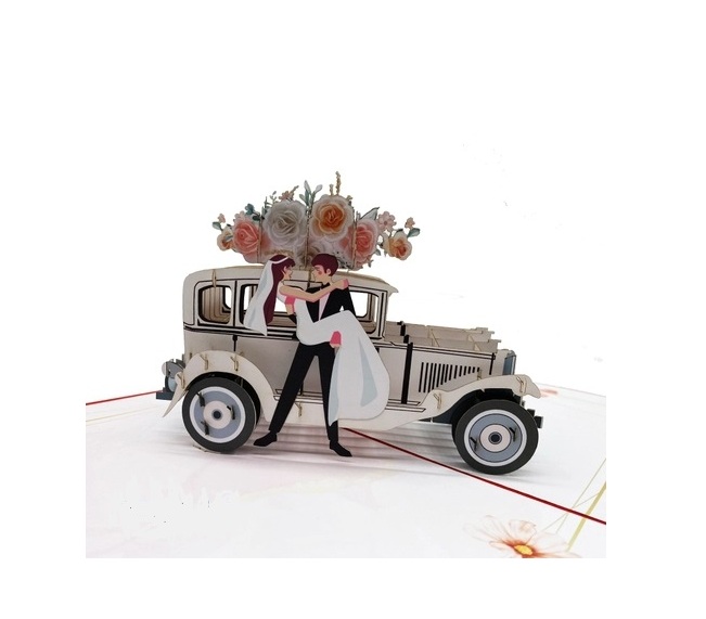 Thiết kế 3D tinh tế: Xe cưới cổ điển bật nổi kèm hoa tươi và cô dâu chú rể.