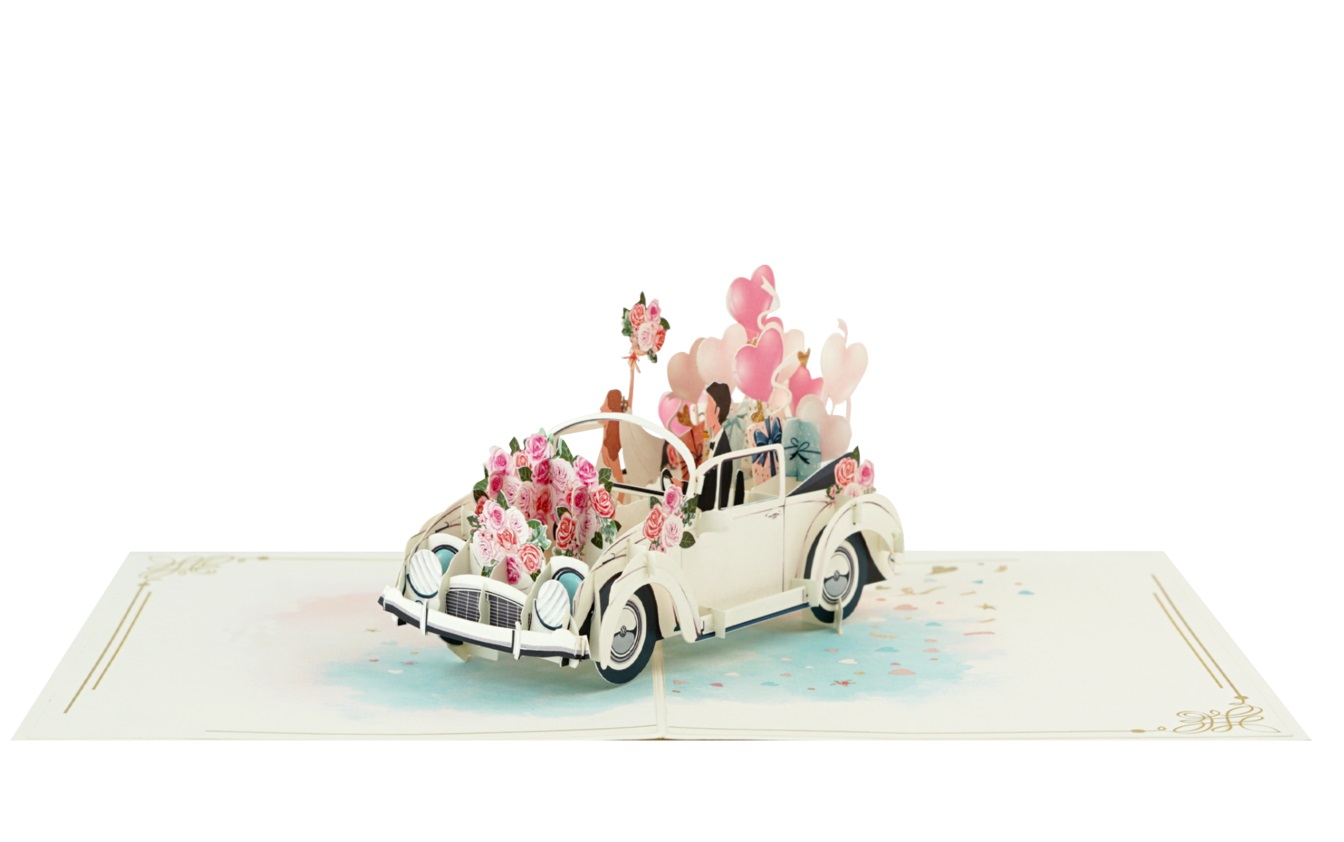 Tạo bất ngờ cho ngày trọng đại với thiệp 3D Pop Up xe cưới Just Married. Khi mở ra, chiếc xe cưới màu đỏ nổi bật bật lên đầy sống động, trang trí hoa tươi