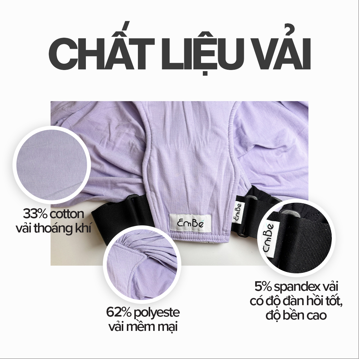 Sản phẩm được làm từ chất liệu cotton thiên nhiên (33%) thân thiện với làn da nhạy cảm của bé. Sự mềm mại, thoáng mát của chất liệu vải giúp bé thoải mái, dễ chịu khi nằm/ ngồi trong chiếc địu.