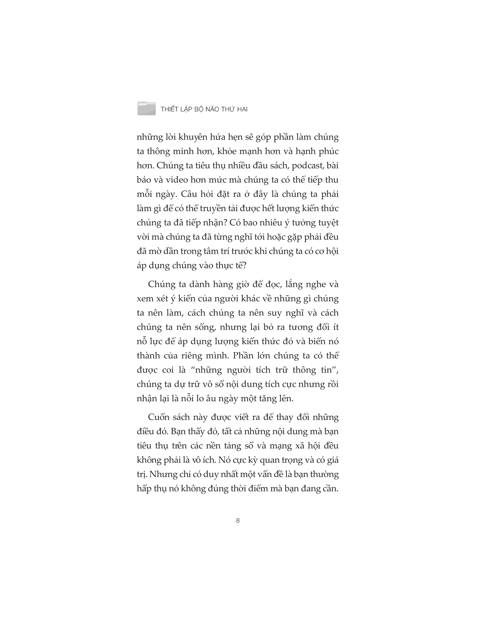 Cuốn sách này sẽ chỉ cho bạn cách xây dựng và áp dụng Second Brain vào cuộc sống và công việc, giúp bạn tận dụng tối đa sức mạnh của thông tin. Qua đó bạn sẽ biết cách: