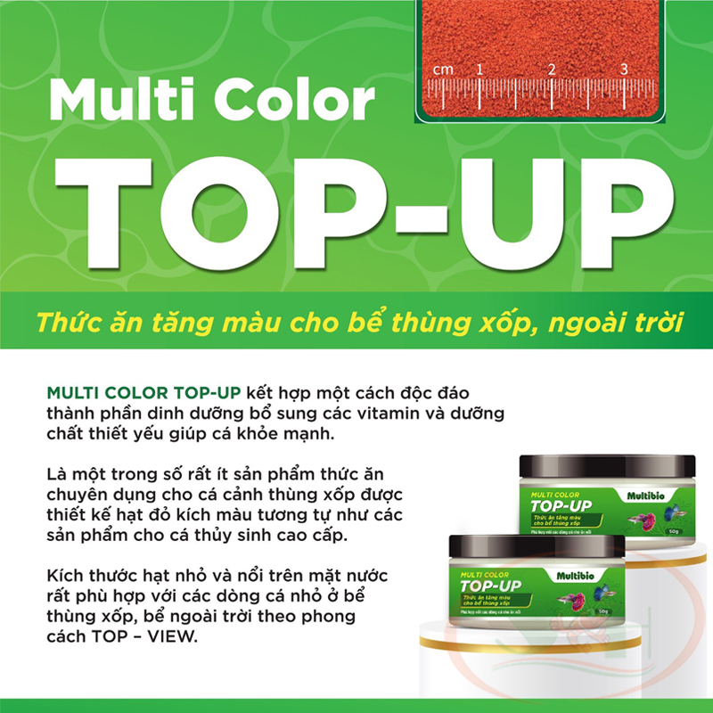 Mua tại TiktokThức ăn cá Multi Color Top Up được thiết kế dạng hạt kích thước nhỏ và có ưu điểm hạt nôi nên rất phù hợp với các dòng cá thủy sinh nuôi dưỡng trong bể dạng top view, thùng xốp ngoài trờ