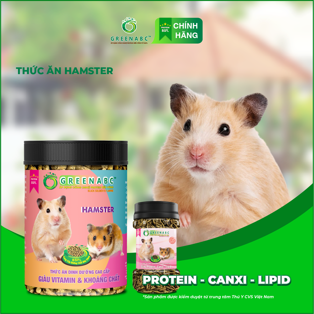 GREENABC là thức ăn cao cấp dành cho HAMSTER. Đặc biệt sản phẩm GREENABC được sản xuất theo phương pháp Áp dụng công nghệ PROTEIN bền vững rất giàu PROTEIN – CANXI – LIPID có trong BSFL, đã được Mỹ (AAFCO) và EU chấp nhận đưa vào công thức cho ngành sản xuất thức ăn dành cho vật nuôi.